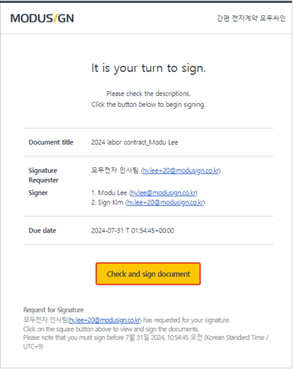 After receiving the signature request via email, click the ‘Check and sign document’ button in the email.