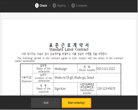 Review the document. When ready to sign, click the ‘Start entering’ button to proceed.