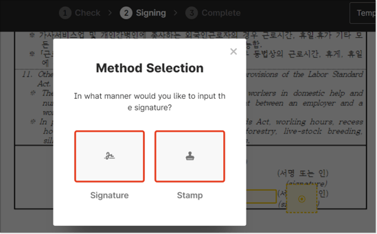 Choose a signature style: Signature or Stamp. (If the requester specifies only one signature method, you can only choose that method.)