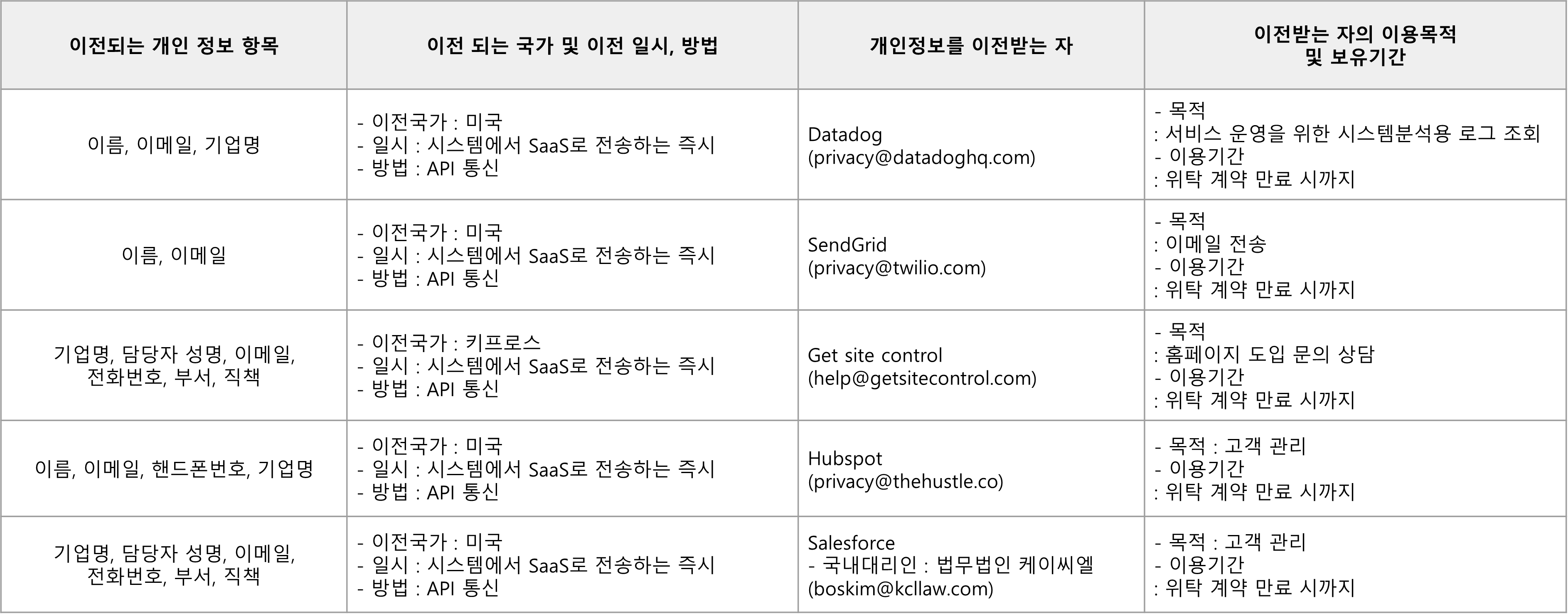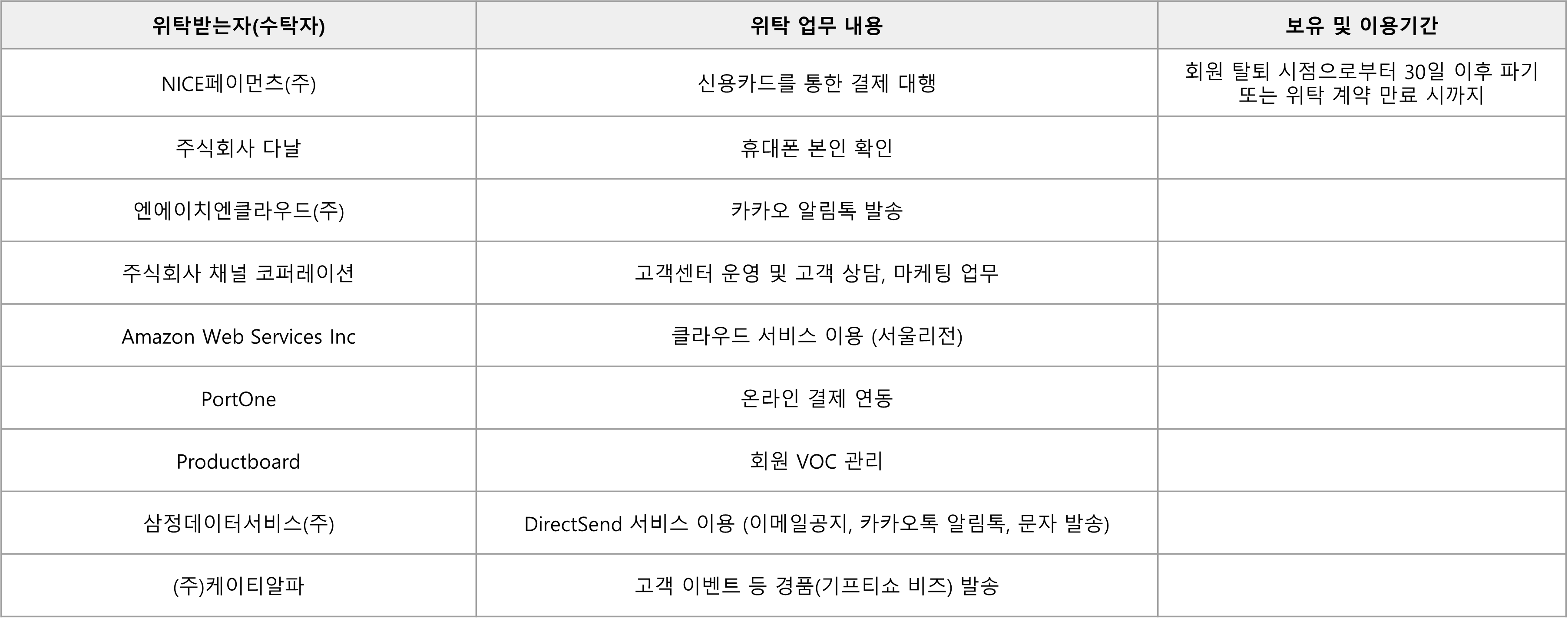 회사는 서비스 향상을 위해 아래와 같이 개인정보를 위탁하고 있으며, 관계 법령에 따라 위탁계약 시 개인정보가 안전하게 관리될 수 있도록 필요한 사항을 규정하고 있습니다.또한, 회사는 위탁계약 체결 시 「개인정보 보호법」 에 따라 위탁업무 수행목적 외 개인정보 처리금지, 기술적·관리적 보호조치, 재위탁 제한, 수탁자에 대한 관리·감독, 손해배상 등 책임에 관한 사항을 계약서 등 문서에 명시하고, 수탁자가 개인정보를 안전하게 처리하는지를 감독하고 있습니다.