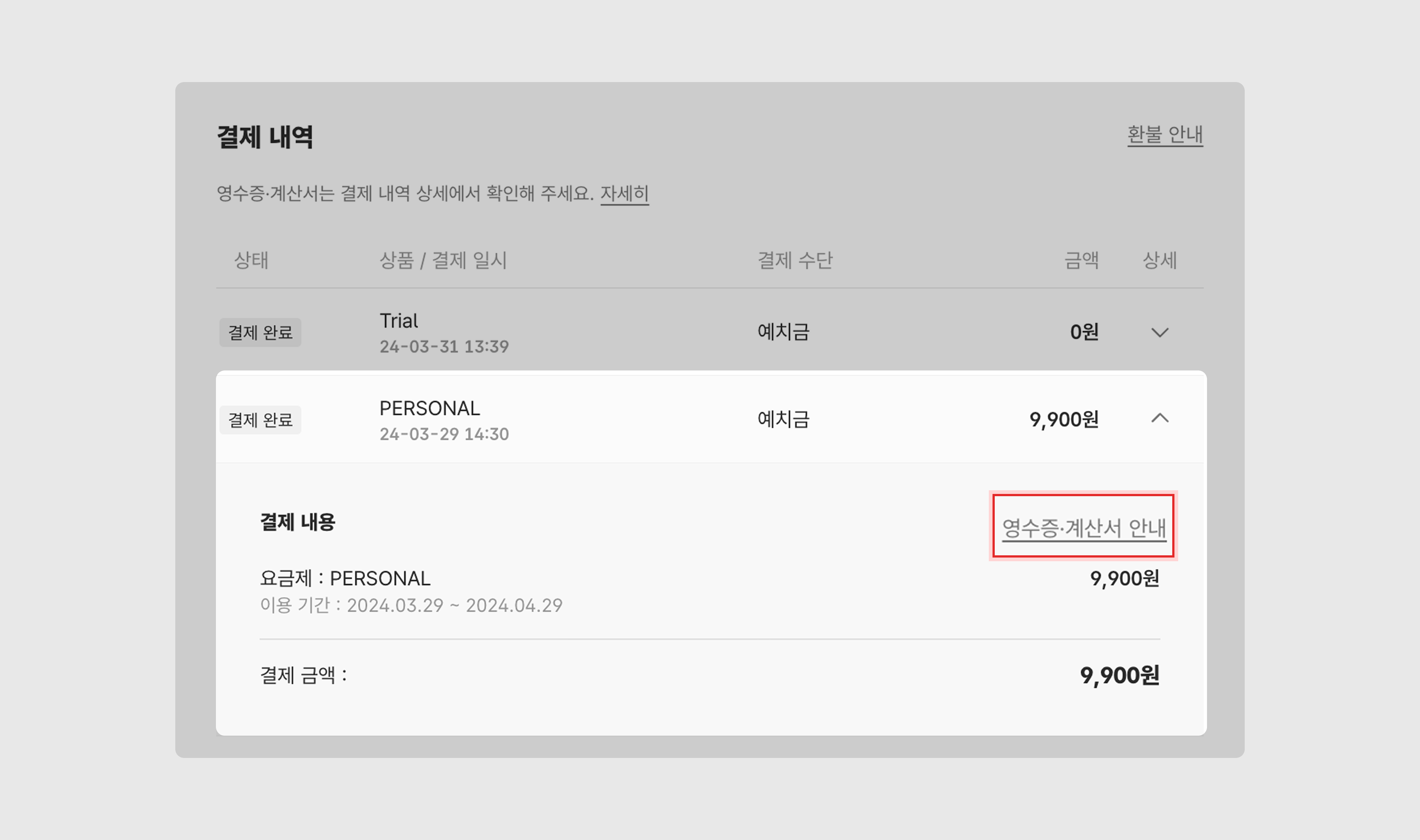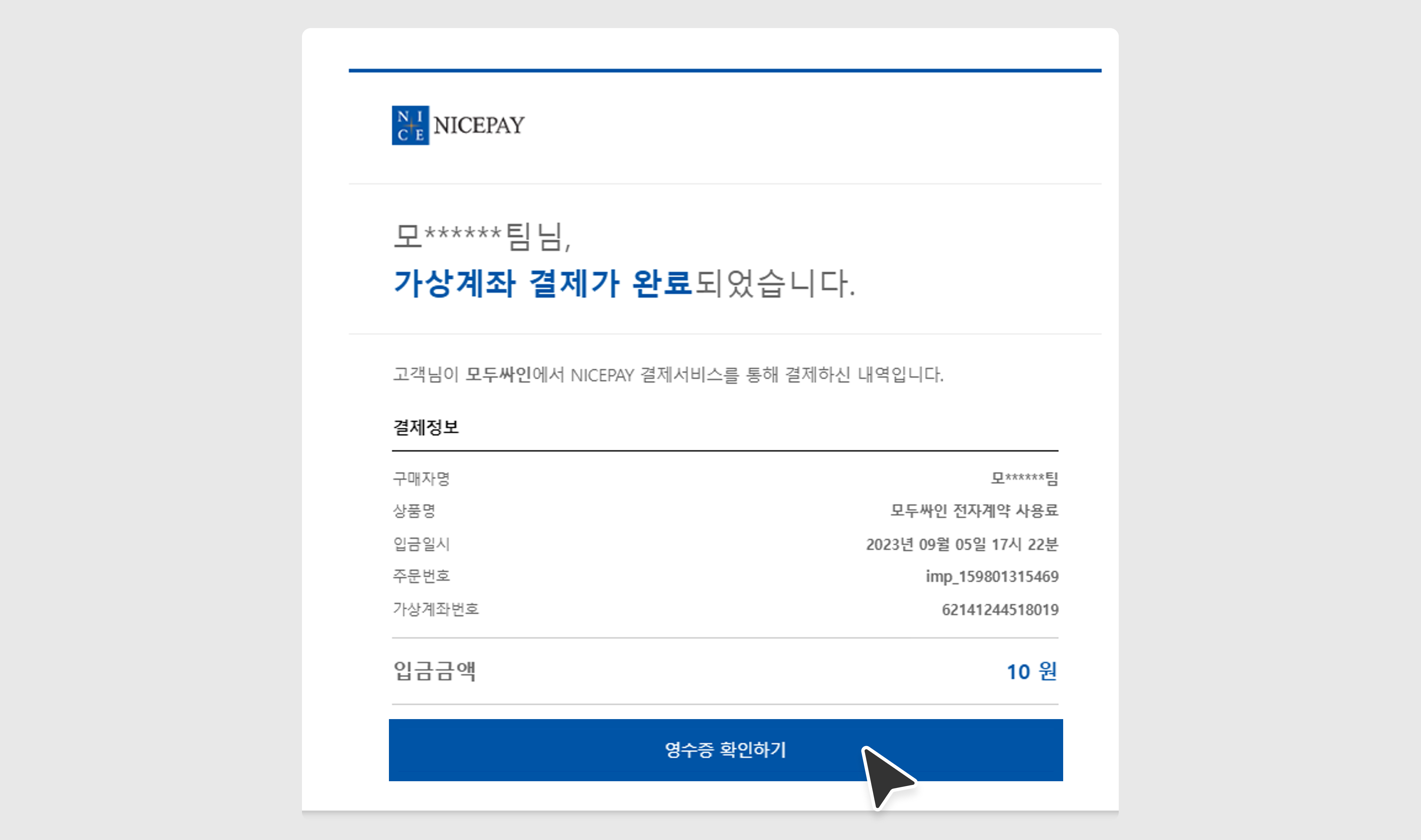 신용카드 및 가상계좌 입금 결제 내역에 대한 영수증은 모두싸인 서비스 내 또는 알림 메일로 확인할 수 있습니다.