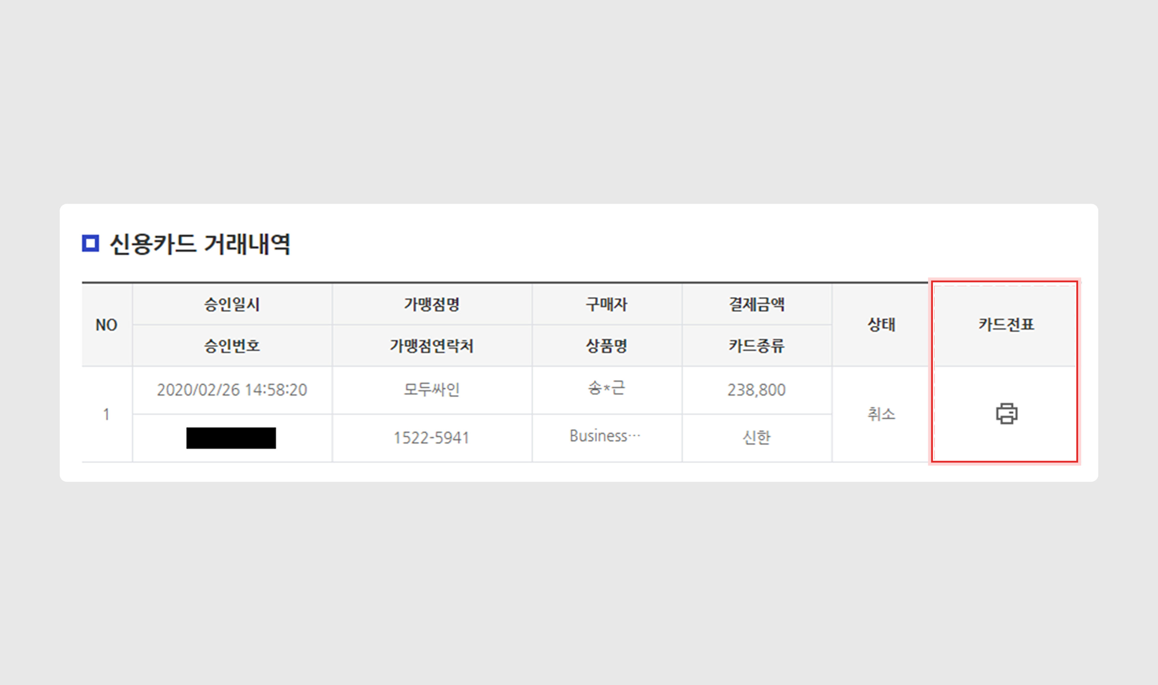 신용카드 거래내역이 나타나면 우측의 [카드전표] 항목의 인쇄 아이콘을 누르면 신용카드 매출전표를 확인할 수 있습니다.