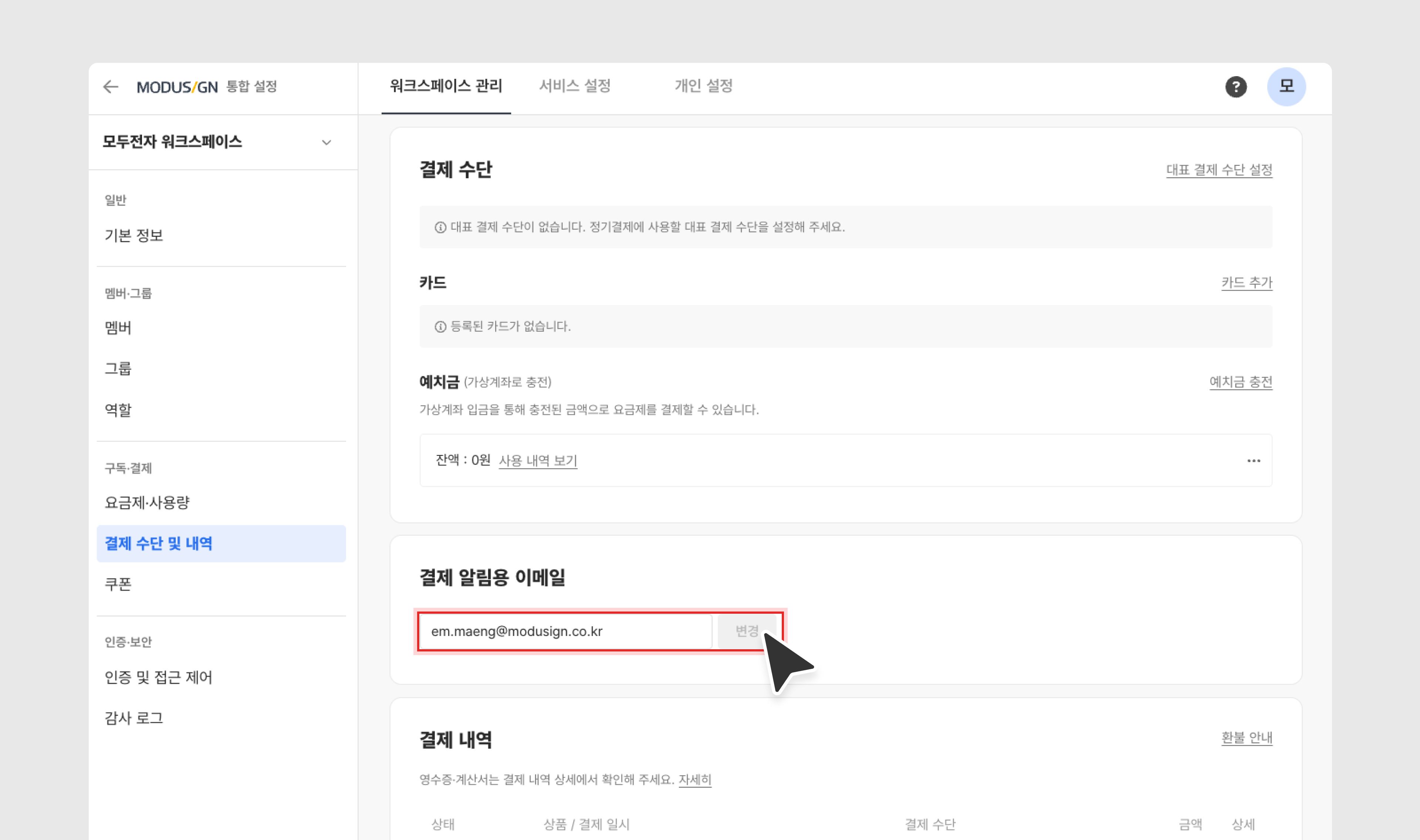 [결제 알림용 이메일]을 확인하고, 필요 시 변경 후 [변경] 버튼을 클릭하여 저장합니다.