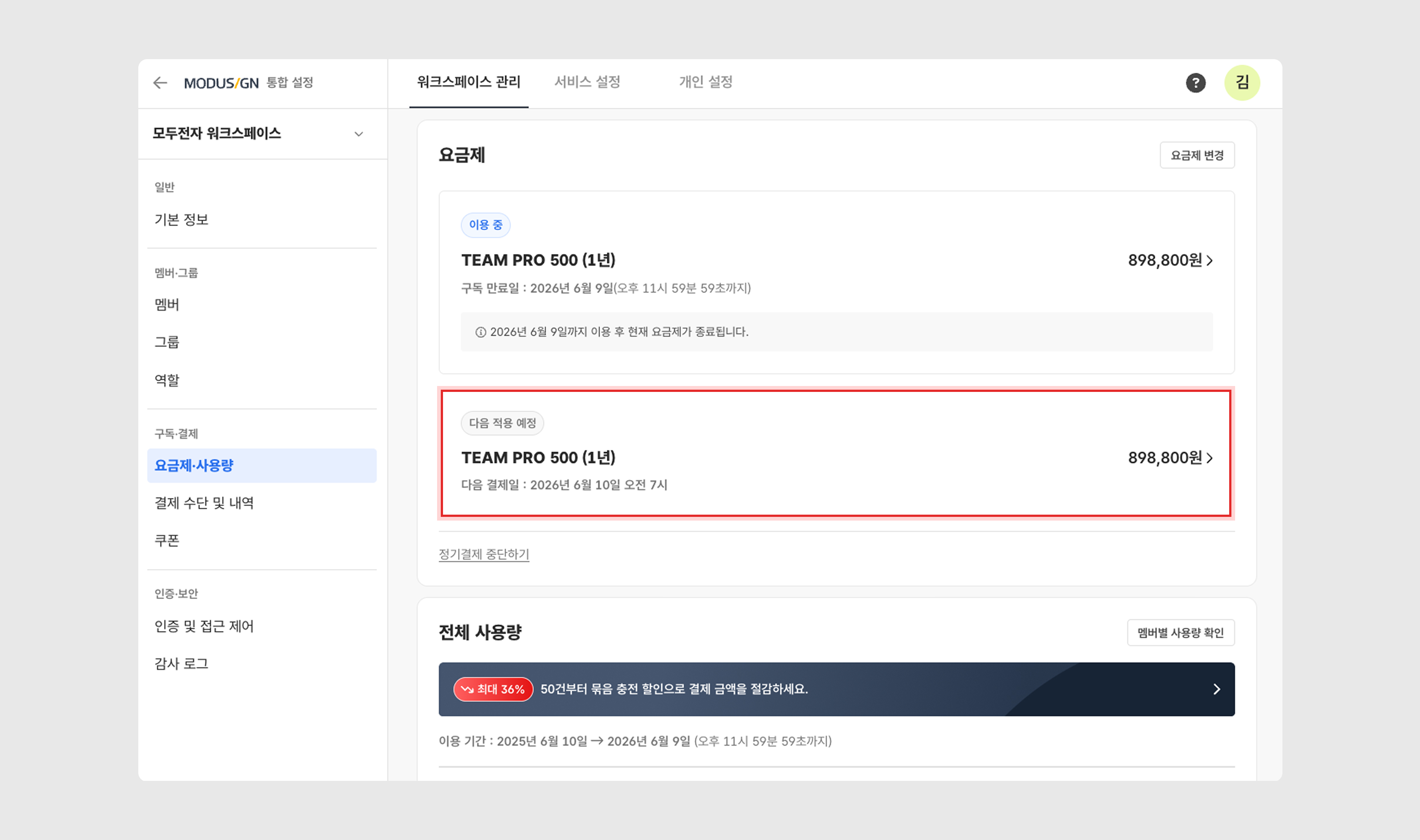 정기 결제를 설정한 경우, 정기 결제일에 요금제가 자동으로 갱신되며 결제가 진행됩니다.