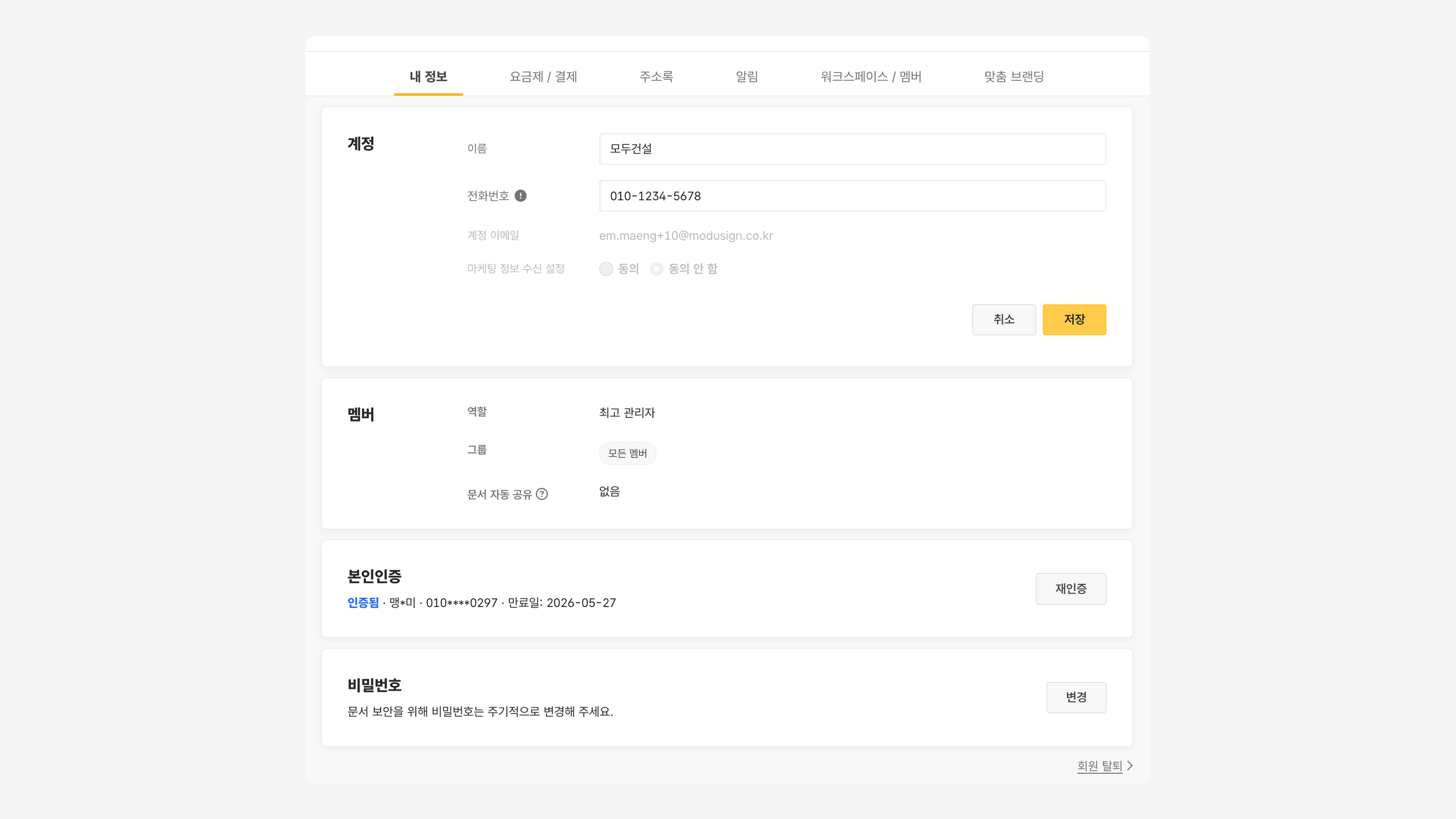 회원 가입 시 등록한 이름, 비밀번호, 추가 정보를 '설정 > 내 정보'에서 변경할 수 있습니다.