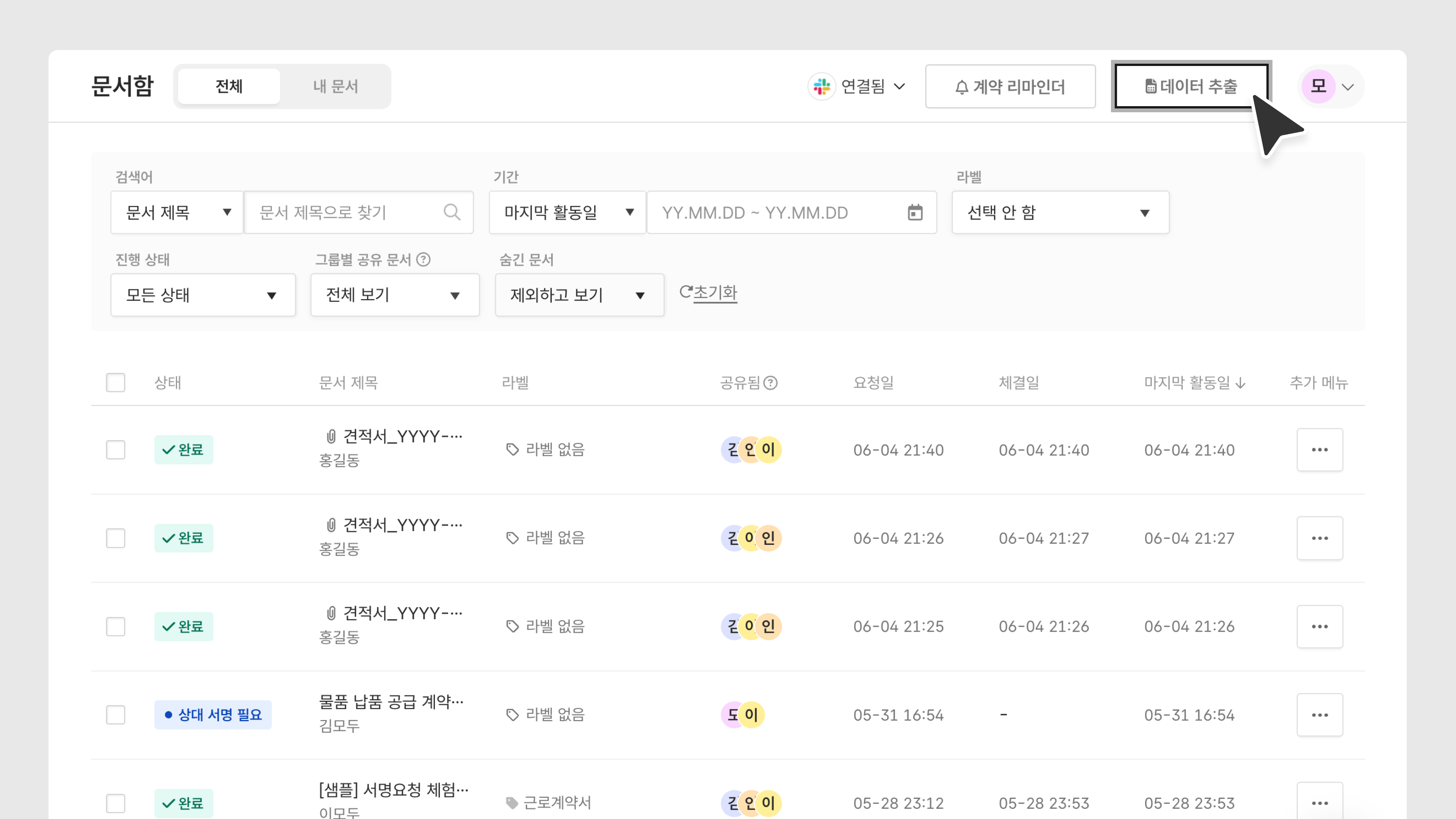 [문서함] 메뉴의 우측 상단에 있는 [데이터 추출]을 클릭합니다.