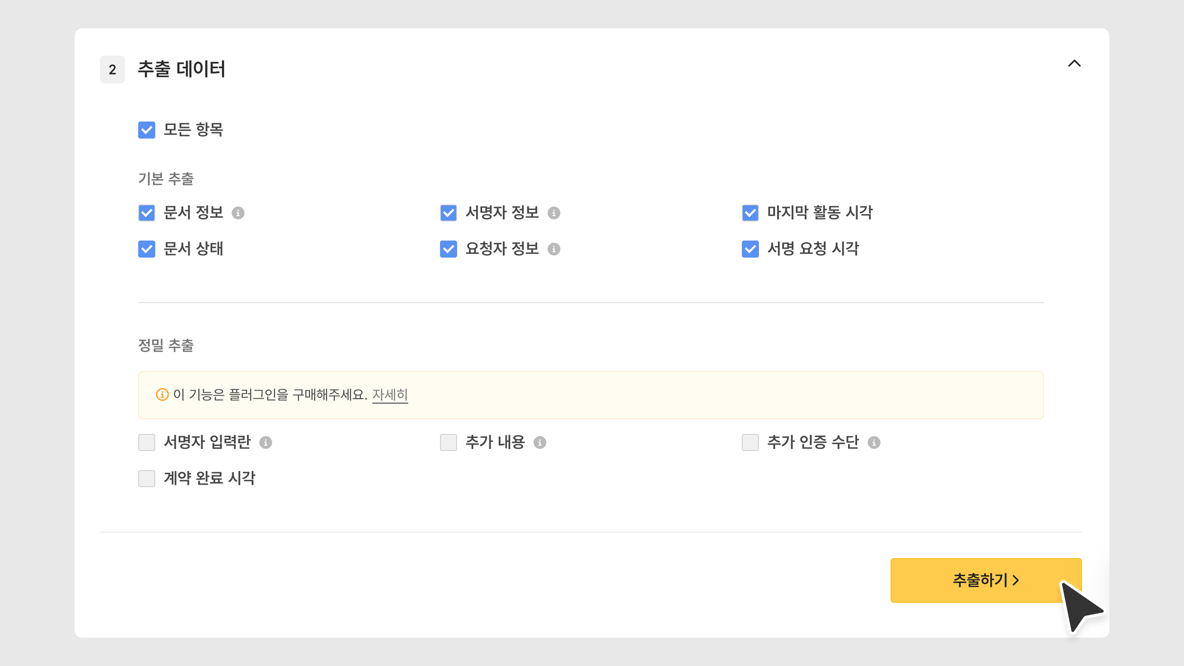 다운로드 할 문서 목록에 포함될 정보를 선택합니다. 모든 선택이 완료되면 [추출하기]를 클릭합니다.
