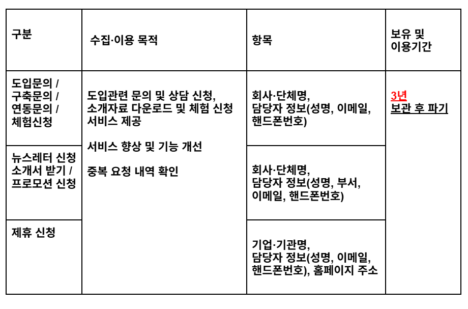 귀하는 위 개인정보 수집 및 이용을 거부할 수 있으나, 동의를 거부하실 경우 도입 문의 및 상담 신청, 소개자료 다운로드 및 체험신청 등의 서비스를 제공 받으실 수 없습니다.