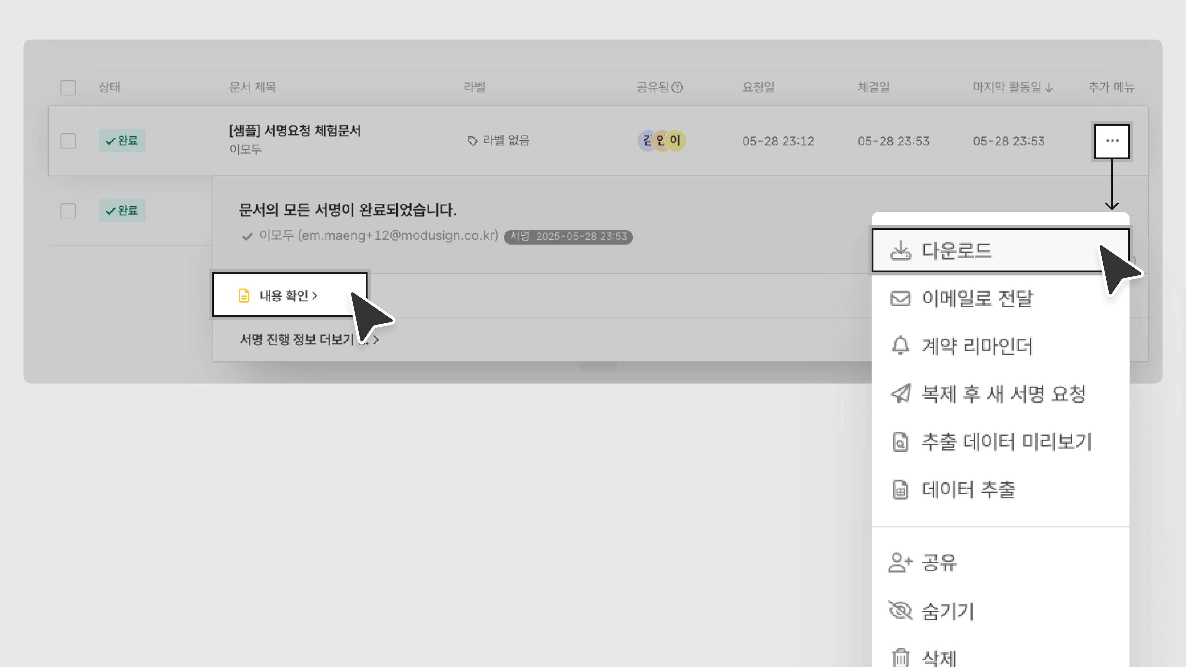 문서 이름 하단의 [내용 확인] 버튼을 클릭하여 내용을 확인하거나, 우측 추가 메뉴(…)에서[다운로드] 버튼을 클릭하여 문서를 다운로드할 수 있습니다.