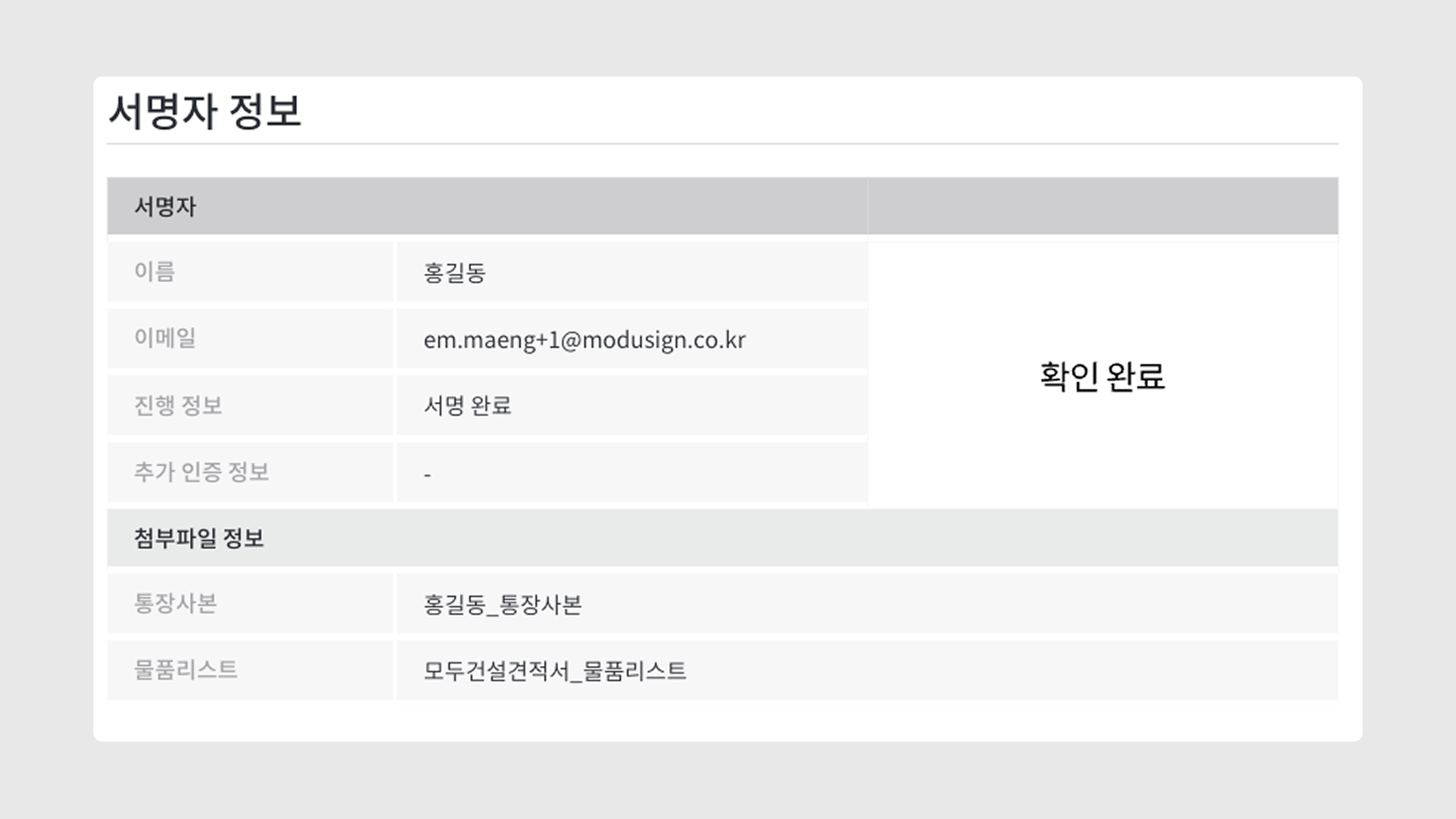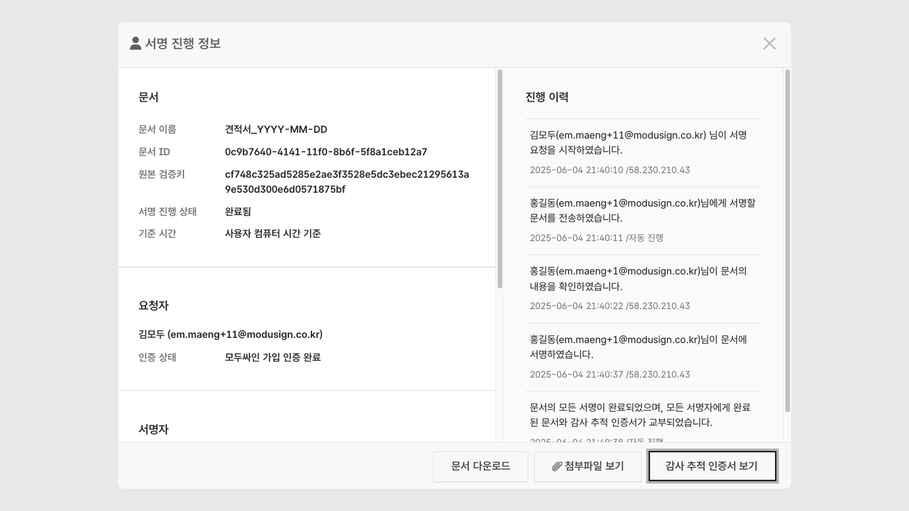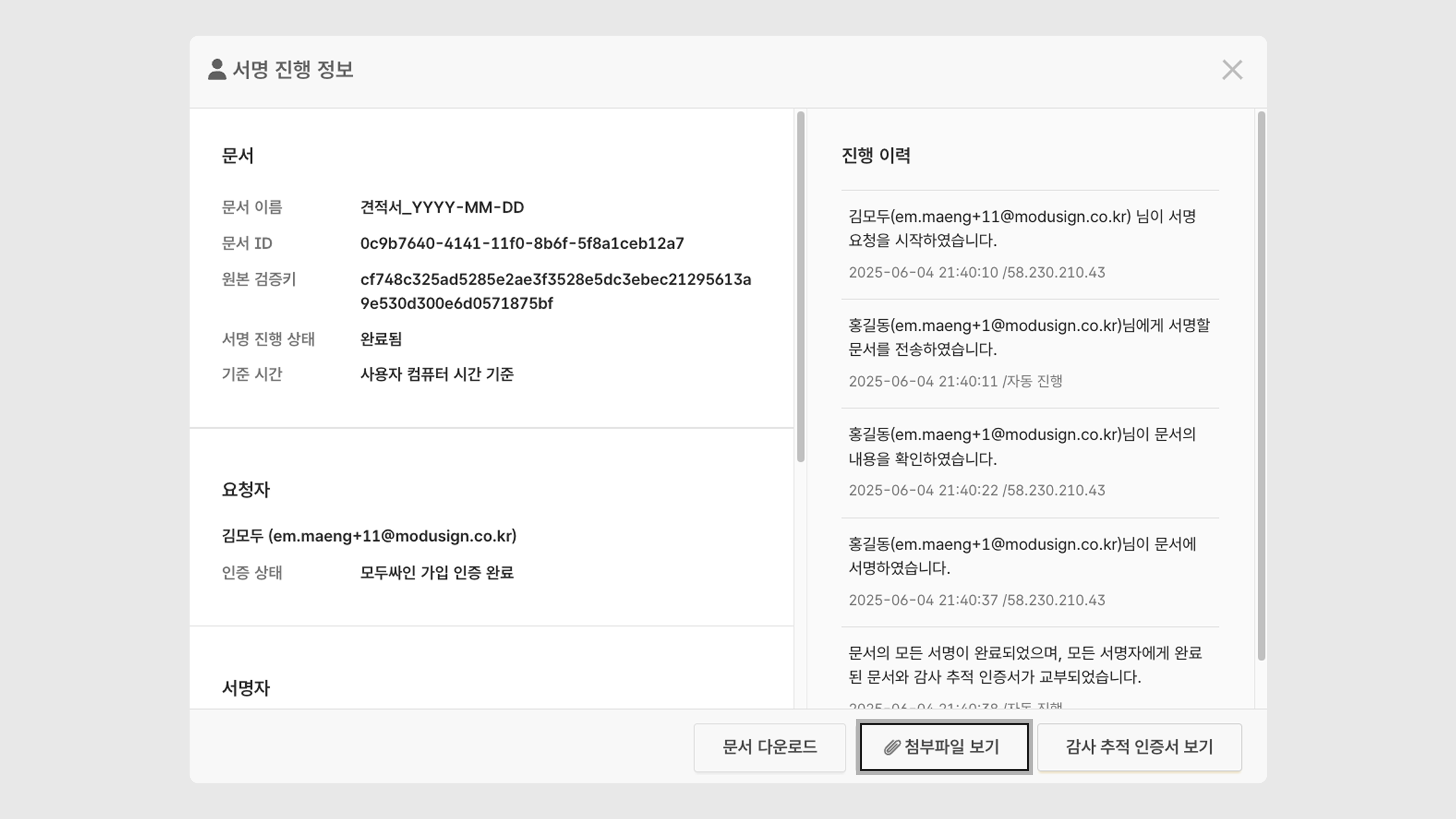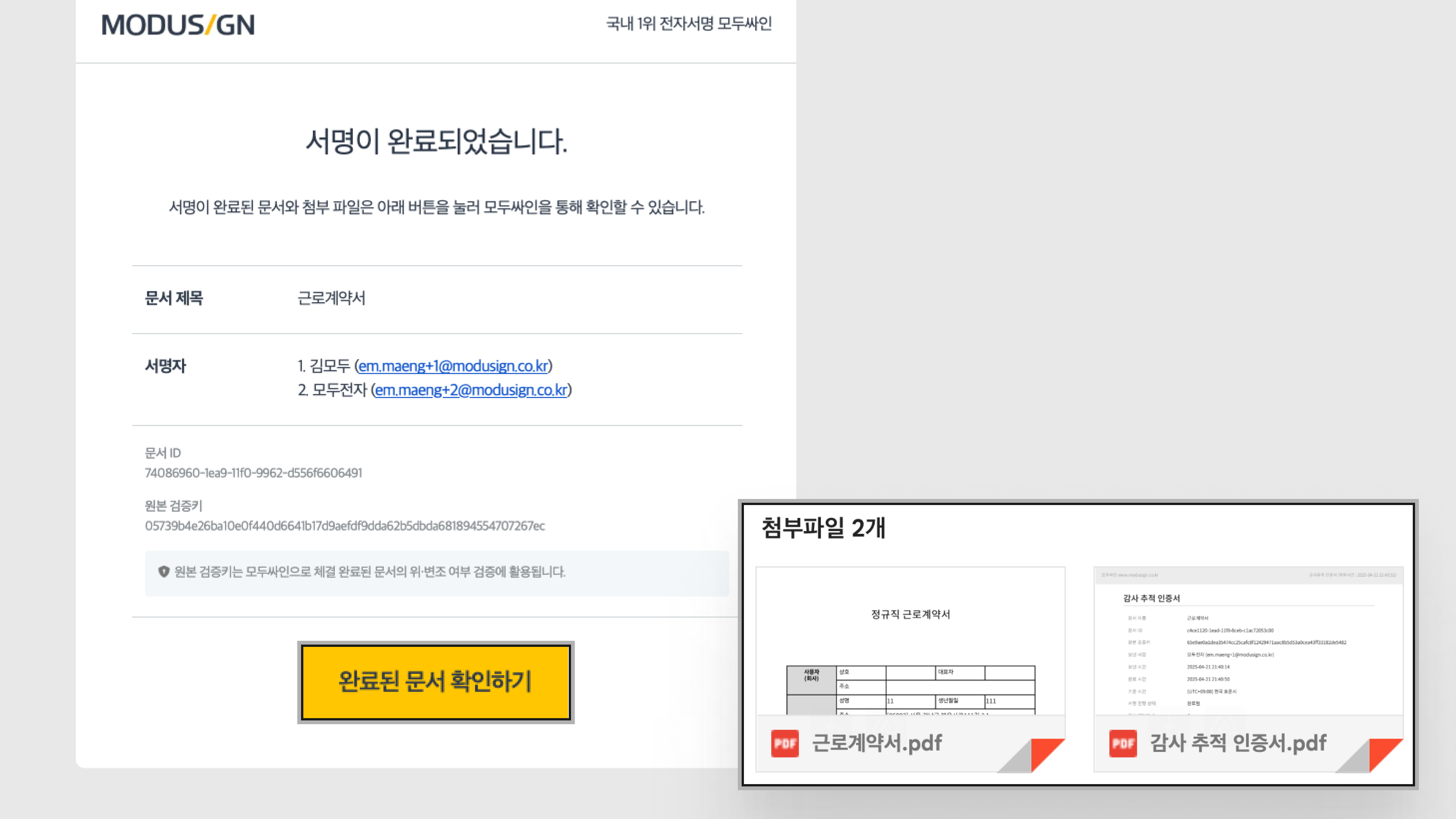 첨부 파일(완료 문서, 감사 추적 인증서)을 다운로드할 수 있습니다.