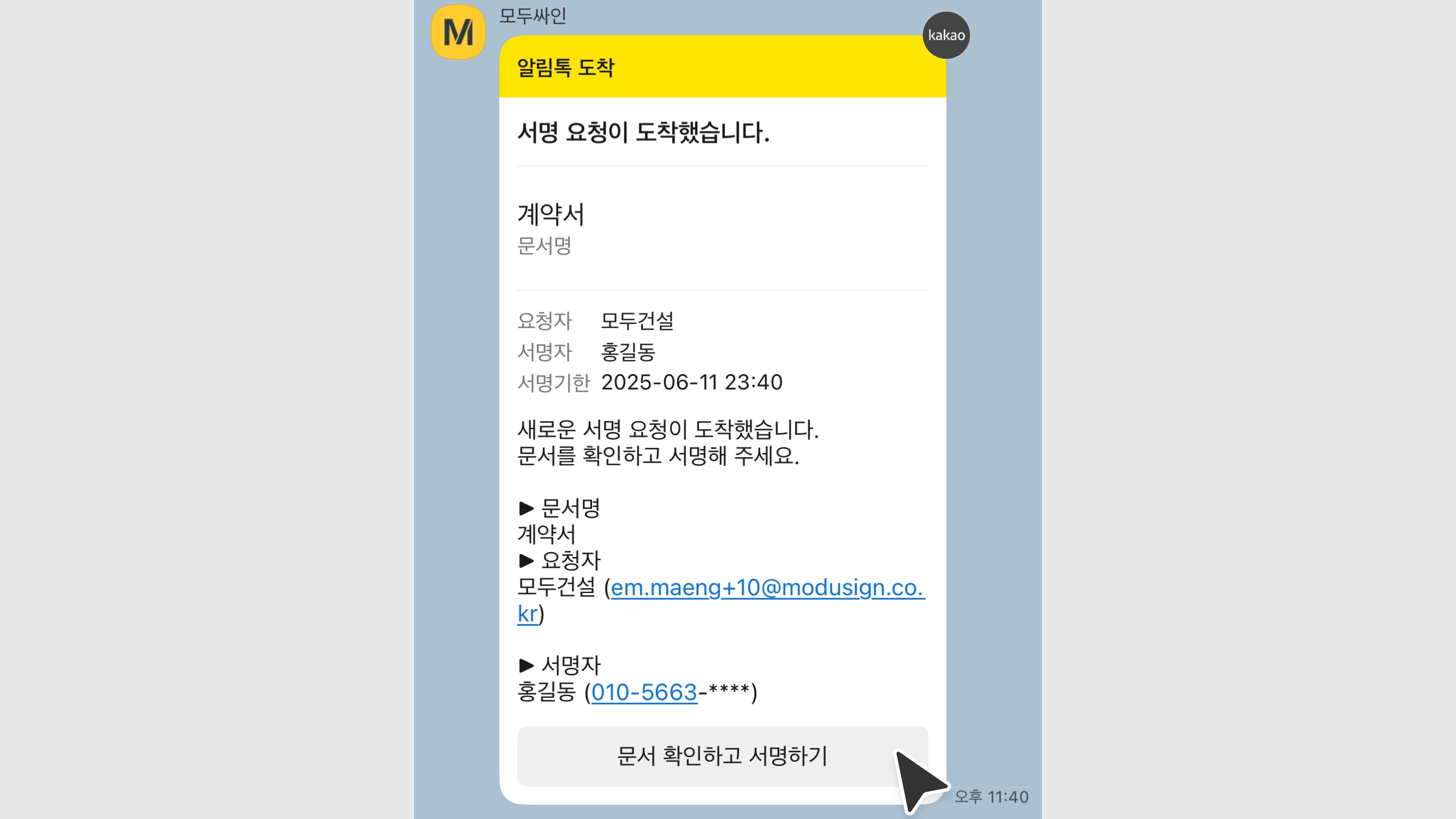 모두싸인 계약을 카카오톡으로 진행한 경우, 아래와 같이 모든 서명이 완료된 메시지의 [문서 확인하고 서명하기] 버튼을 통해 문서를 열람 및 다운로드할 수 있습니다.