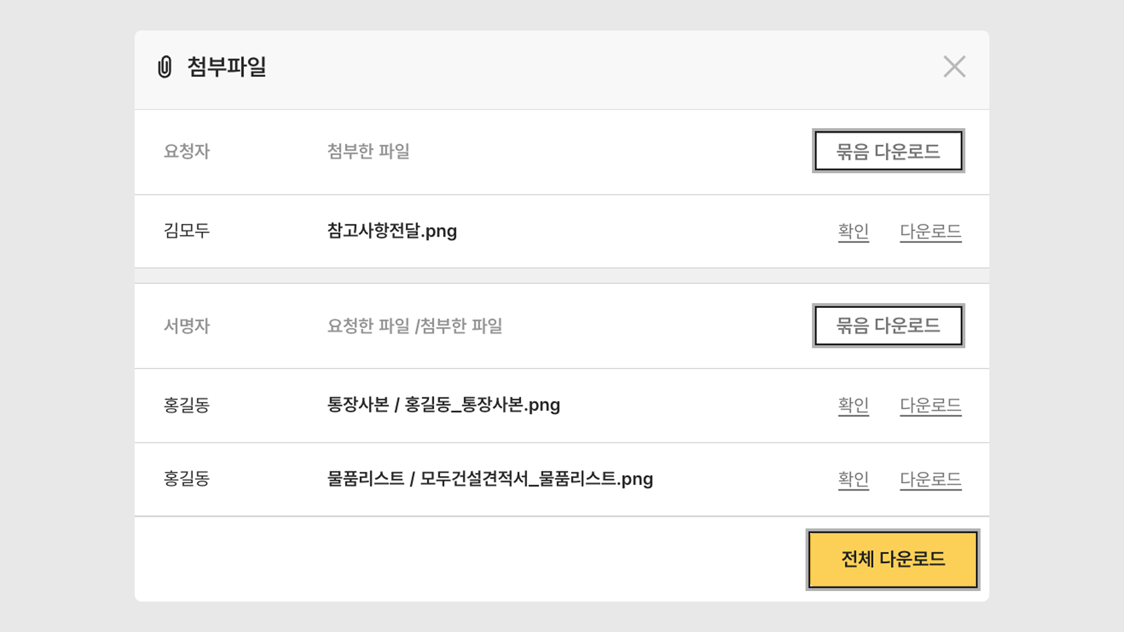 [전체 다운로드] 클릭 시 서명요청자와 서명자의 모든 첨부파일을 압축하여 다운로드 할 수 있습니다.