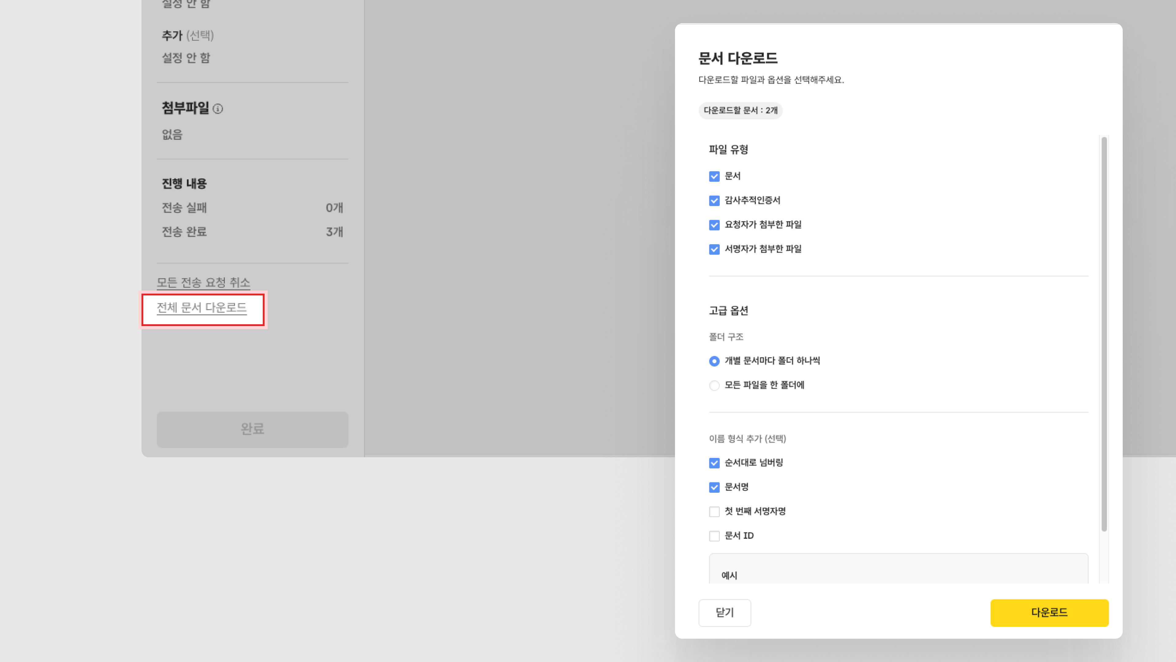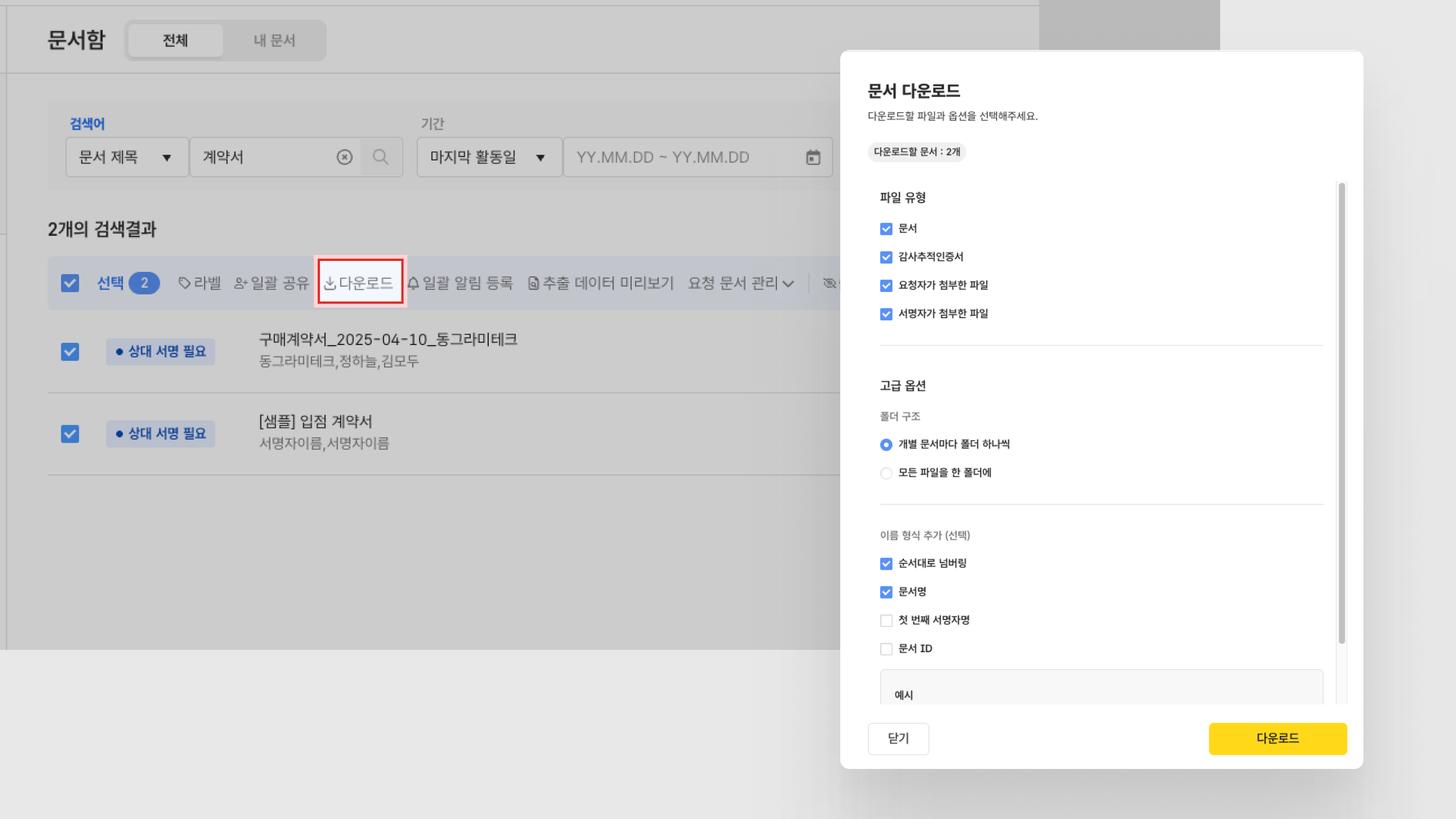 완료 상태인 문서만 다운로드 가능하며, 그 외 상태의 문서는 다운로드 대상에서 자동 제외됩니다.