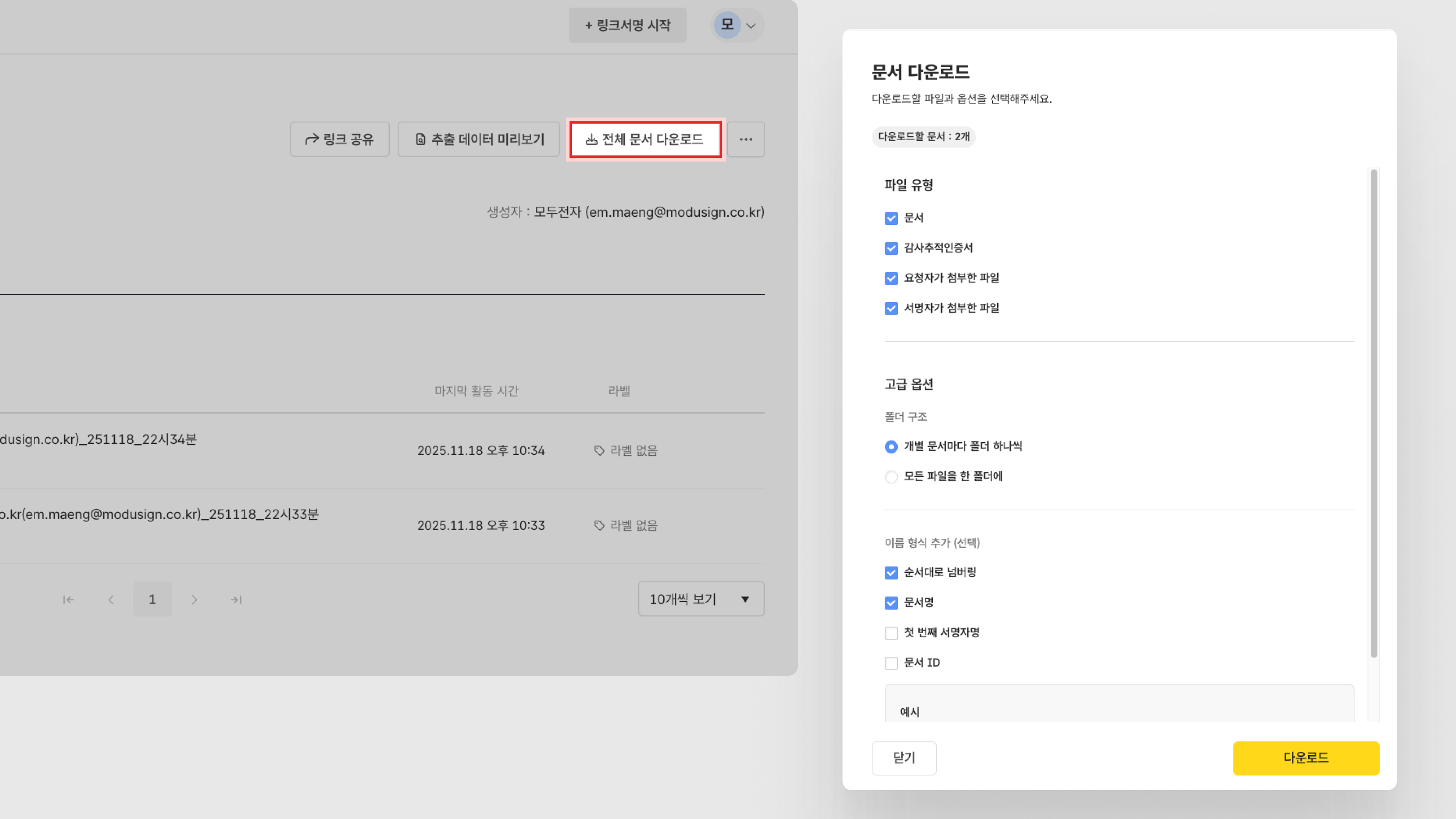 링크서명을 여러 개 생성했다면, 생성 건 마다 클릭하여 전체 문서 다운로드를 진행해야 합니다.