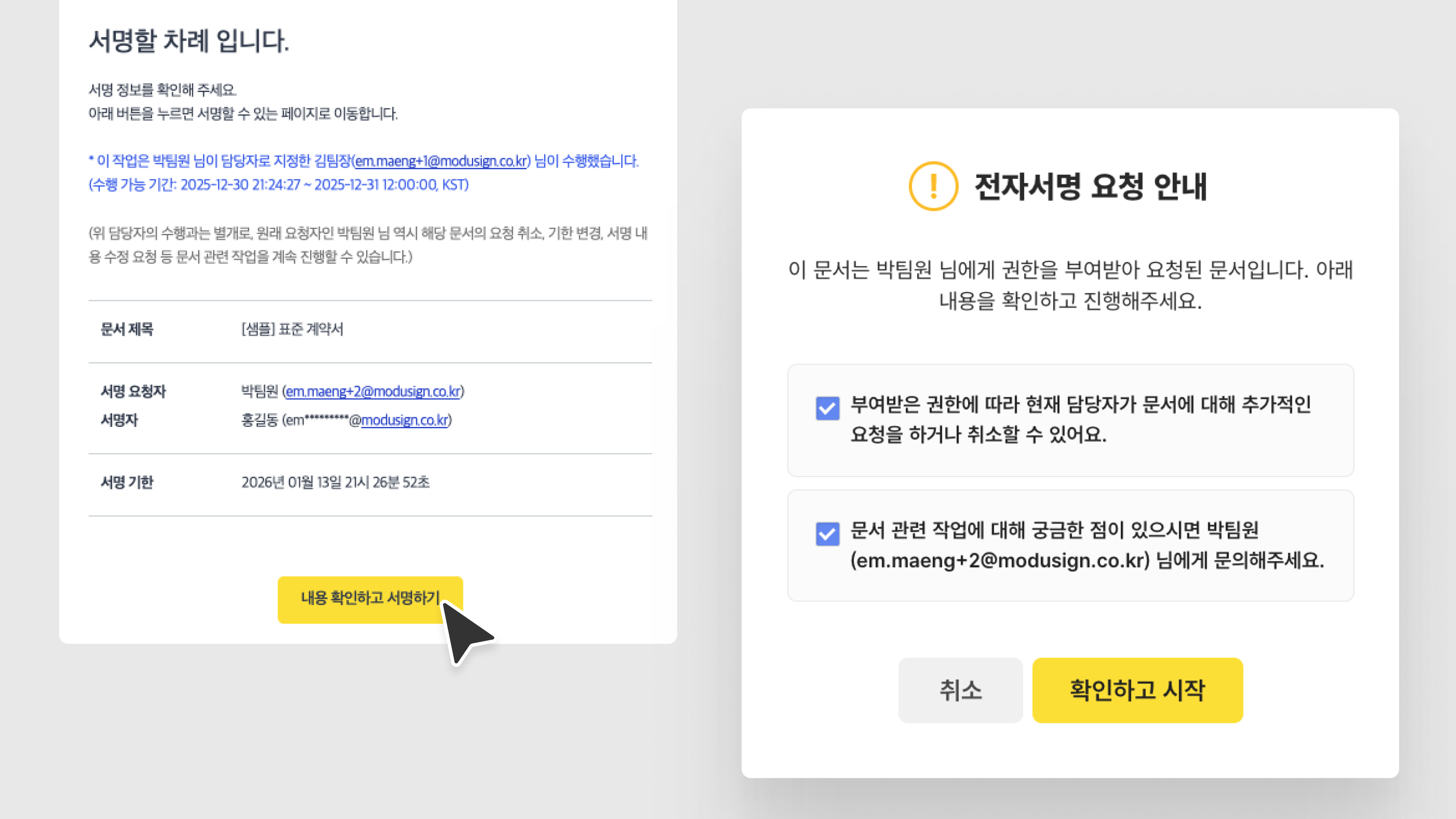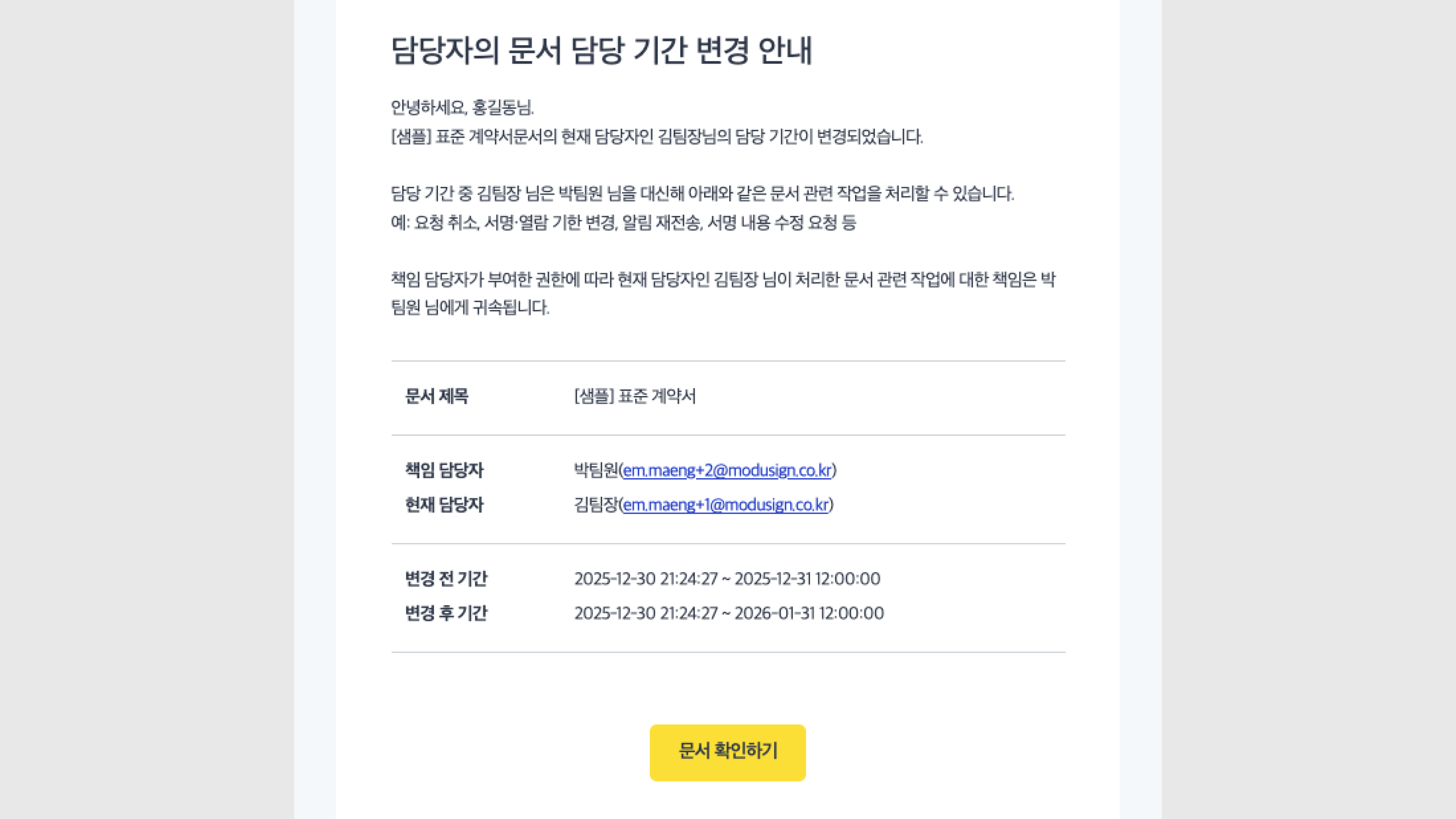 권한 수행자가 서명·열람 요청한 문서가 아직 진행 중이라면, 서명자에게 권한 변경에 대한 알림 메일이 전송됩니다.