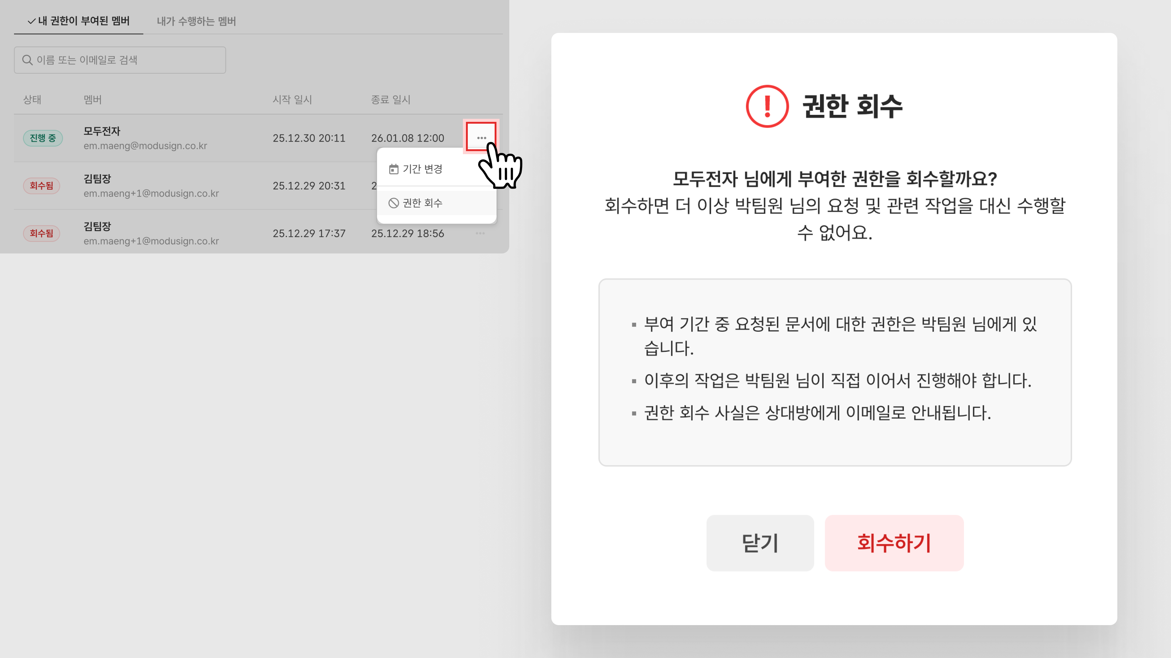 ‘진행 중’ 상태의 멤버에서 권한을 회수할 대상 확인 > 우측 [...] 클릭 > [권한 회수] 클릭