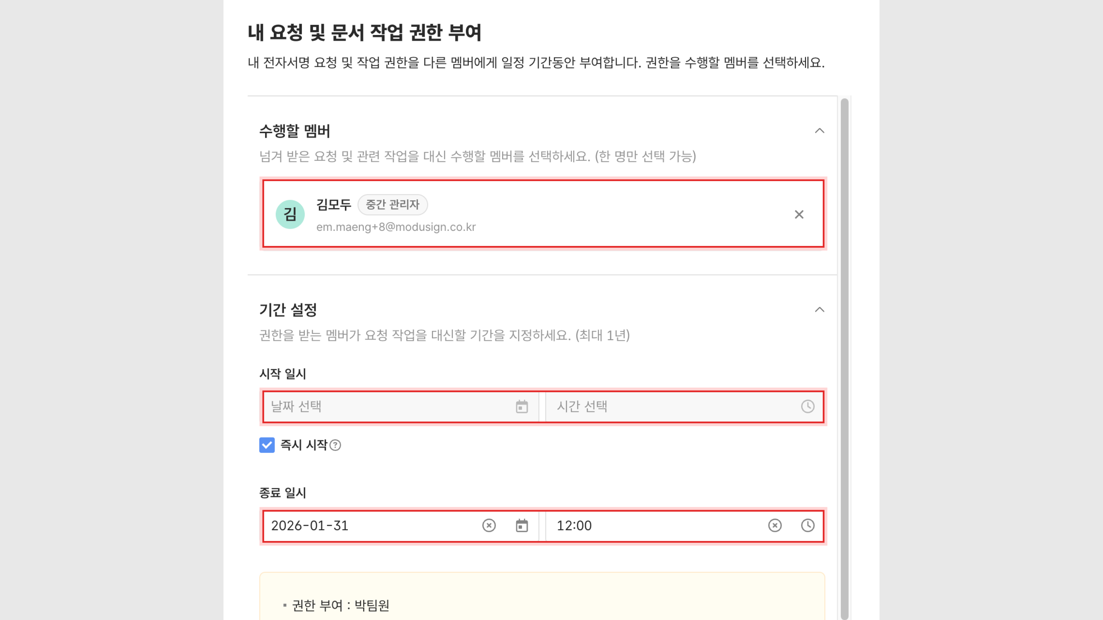 권한 부여 시, 시작일과 종료일을 함께 설정해야 합니다. (최대 1년 설정 가능)