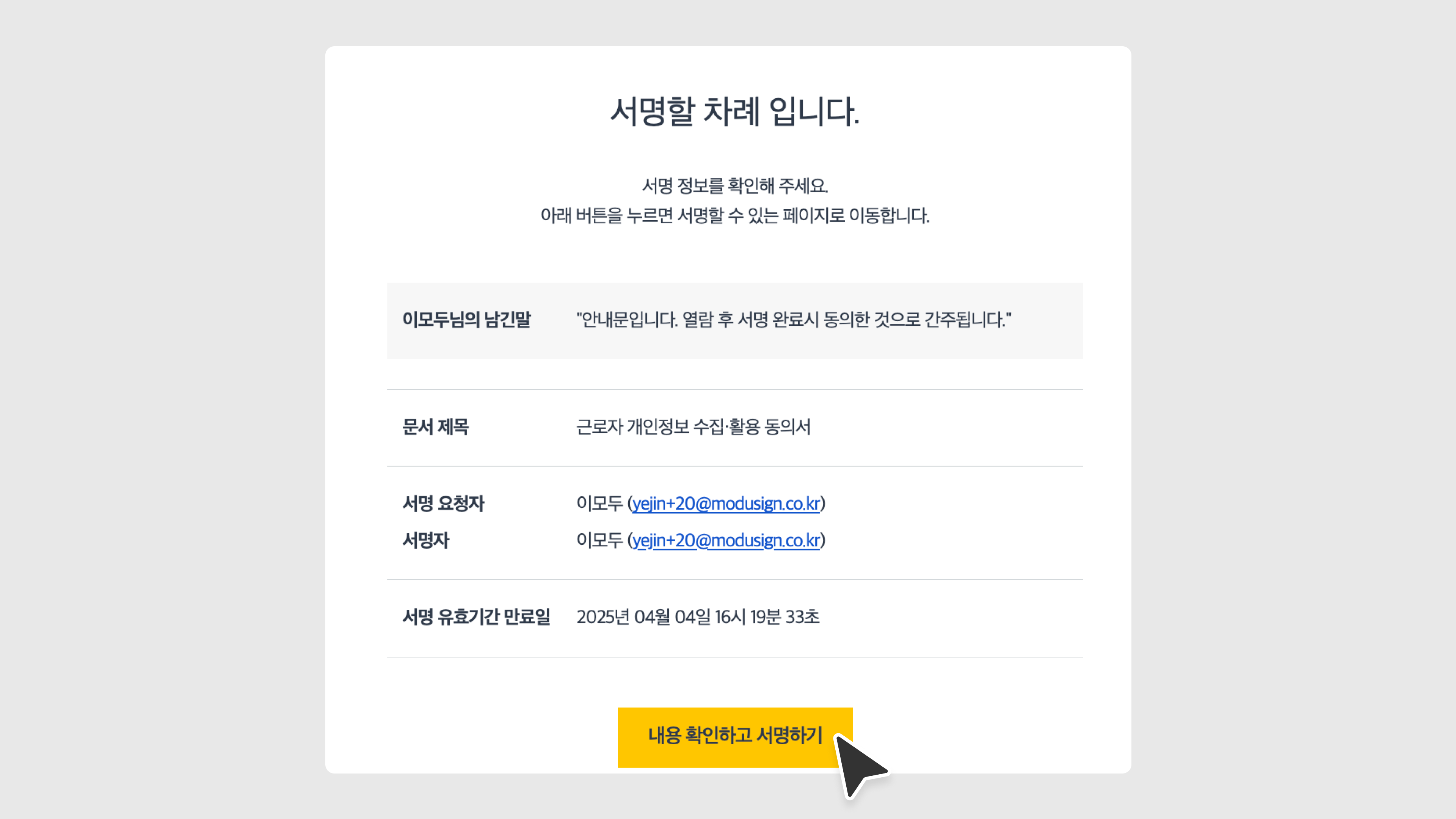 1. 입력란이 없는 서명 요청 문서를 전달받은 메일함 또는 카카오톡 채팅방에서 [내용 확인하고 서명하기] 버튼을 눌러 문서 확인을 진행합니다.