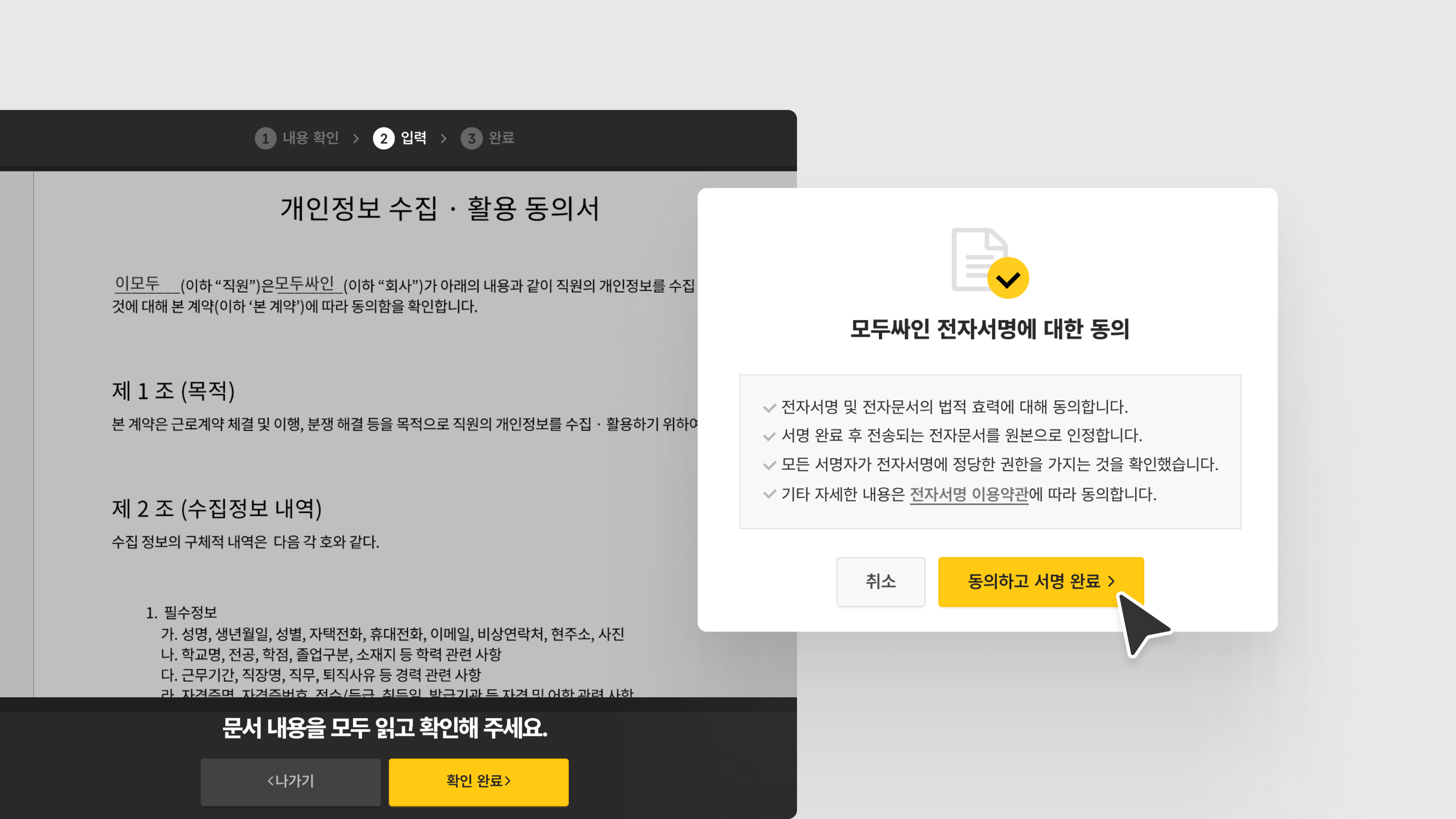 2. 확인 완료 버튼 클릭 후, 전자서명에 대한 [동의하고 서명 완료 >] 버튼을 누르면 문서 확인 및 서명이 완료됩니다.