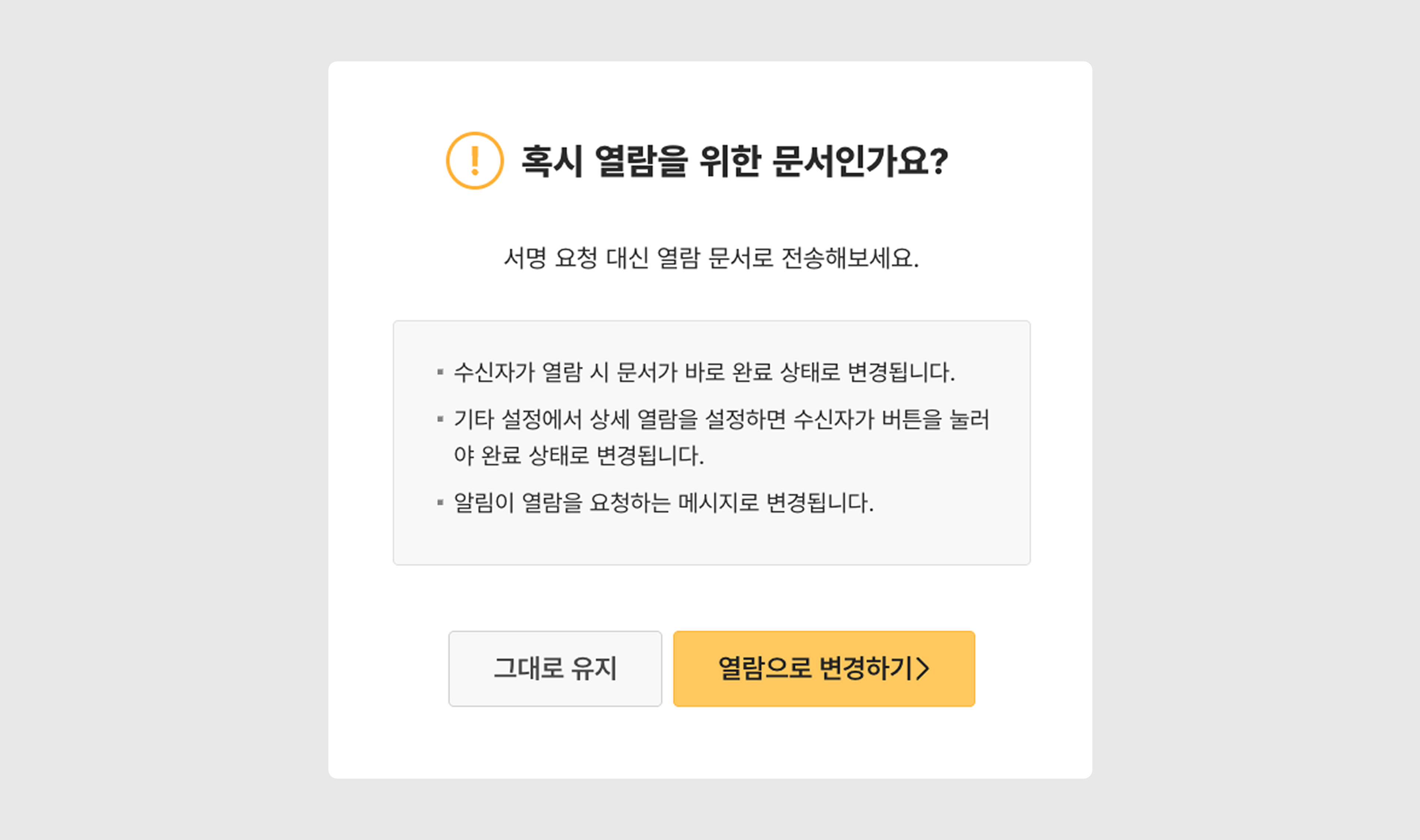 따라서 ‘열람 요청’은 상대방에게 내용을 통지하거나 안내하기 위한 목적의 발송 기능으로, 문서 열람 여부를 확인할 수 있습니다. ‘사인/도장 없는 서명자 기능’은 직인 또는 날인 절차 없이도 동의 의사를 확인하는 기능입니다.