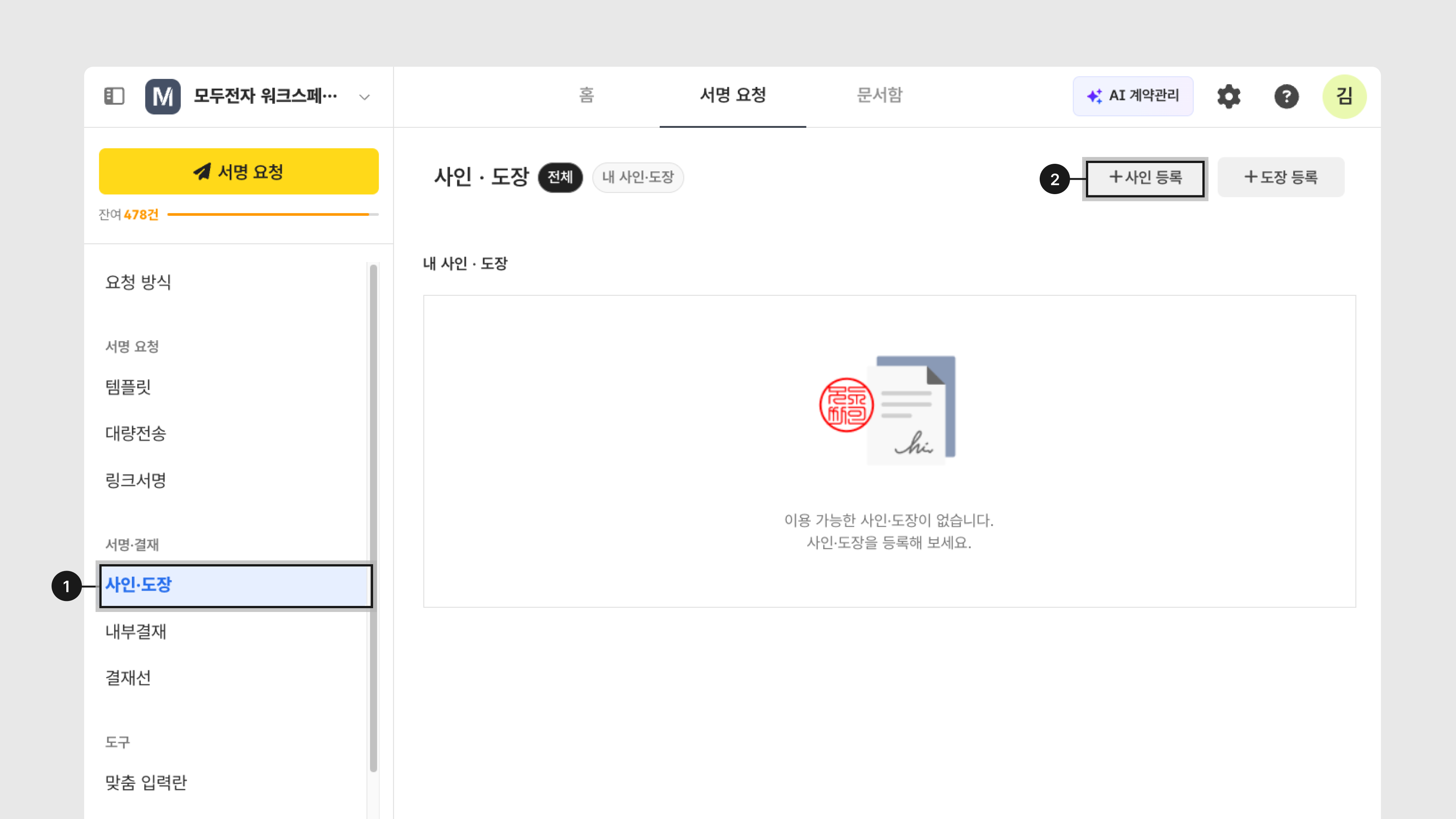 사인/도장 페이지에 사인이 추가되며, 전자 계약 시 이용할 수 있습니다.