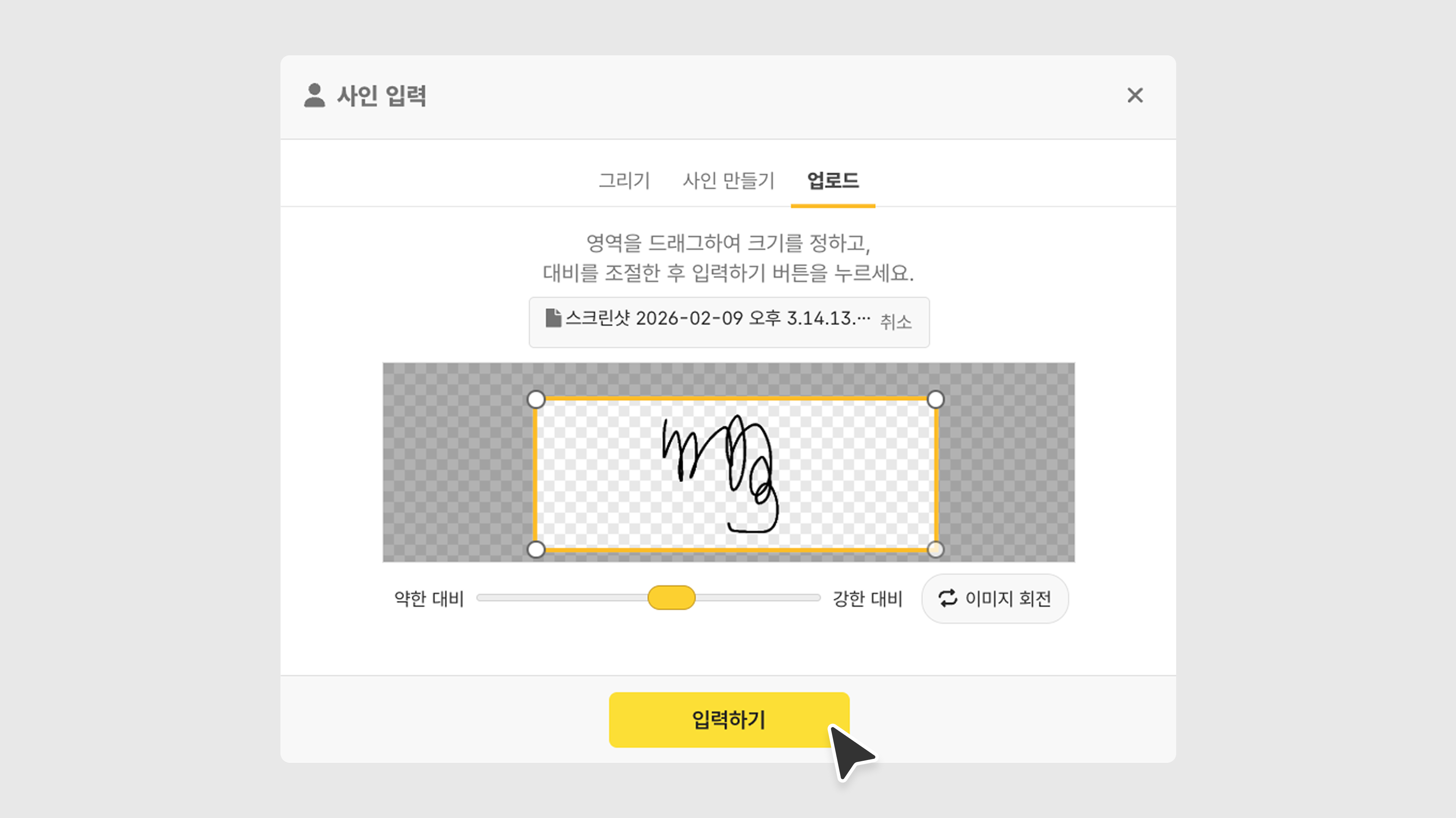 업로드 : 사인 스캔 파일을 업로드하여 사인을 만들 수 있습니다.