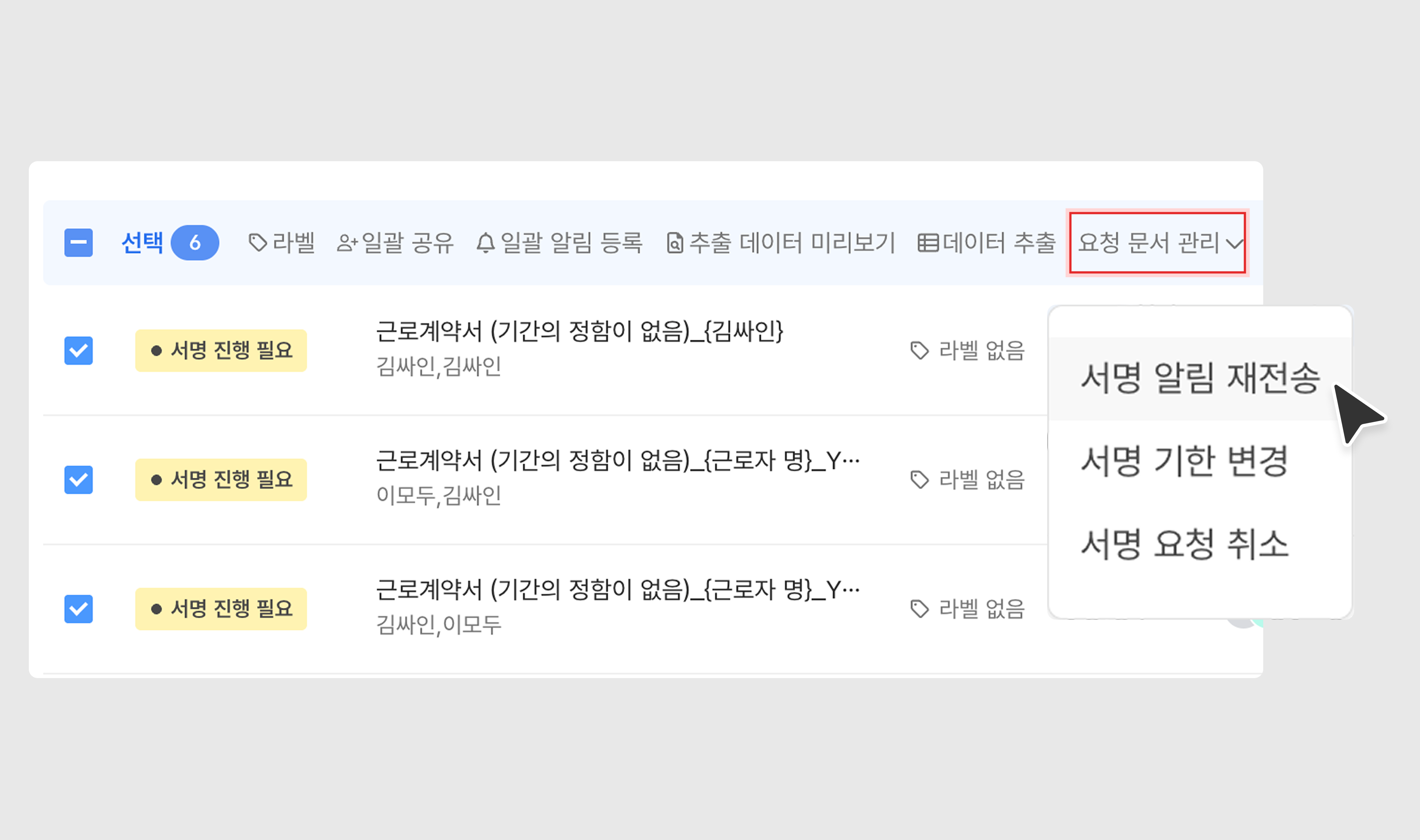 여러 문서를 선택한 후, 상단의 [요청 문서 관리] > [서명 알림 재전송] 버튼을 클릭하여 한 번에 여러 문서에 대해 서명 알림을 일괄 재전송할 수 있습니다.