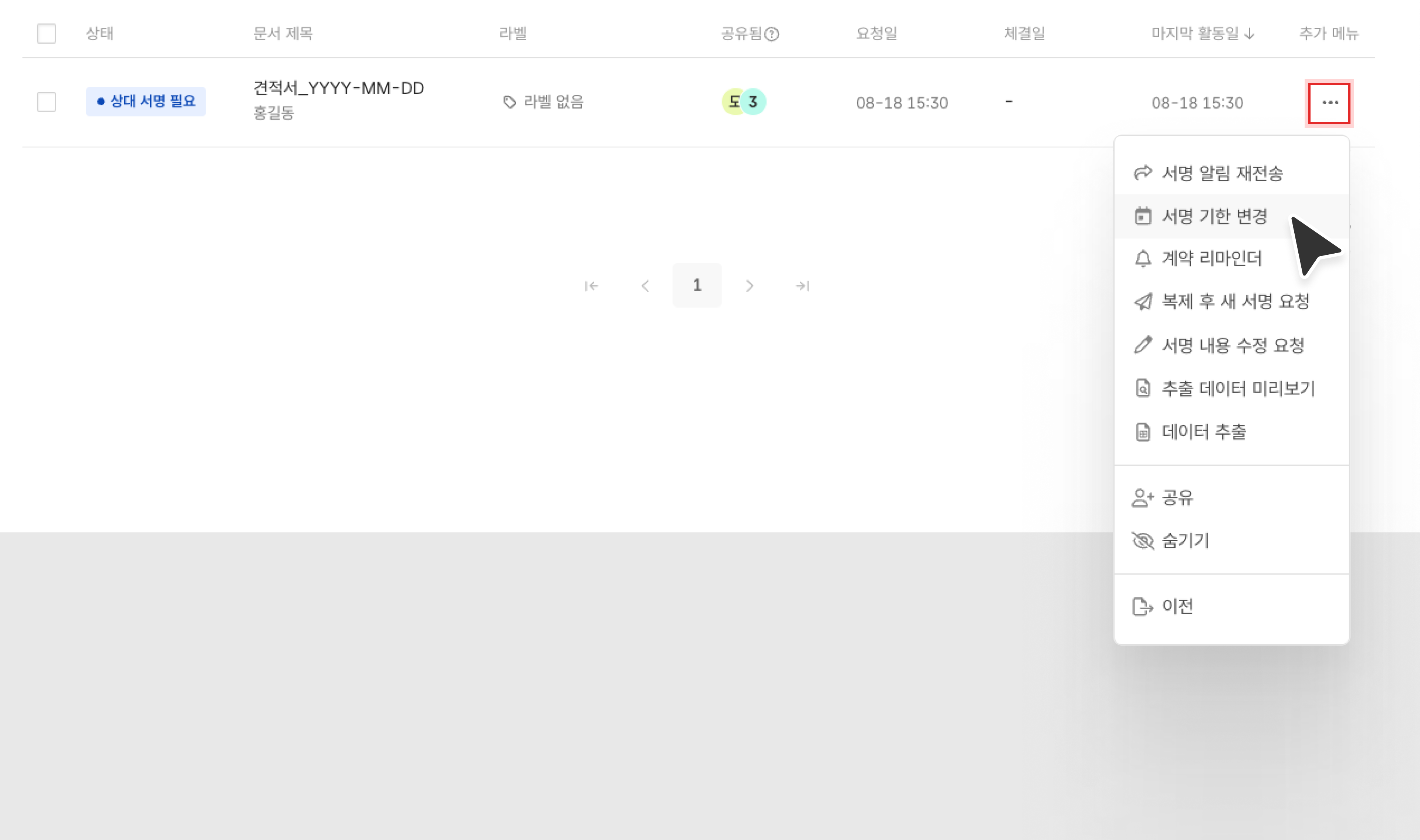 좌측의 [문서함] 메뉴 > 기한을 변경할 문서 우측의 [...] 클릭 > [서명 기한 변경] 을 클릭하여 변경할 수 있습니다.