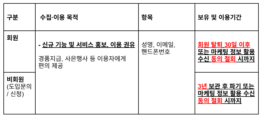 본인은 귀사의 마케팅 정보 수신에 동의하지 않을 수 있으며, 동의하지 않을 때에는 경품 제공, 최신 기능 소개, 서비스 소개, 사은 행사(요금 할인, 무료 쿠폰 제공 등) 안내 등 이용 목적에 따른 혜택에 제한이 있을 수 있고 그 밖에 계약과 관련된 불이익은 없습니다.