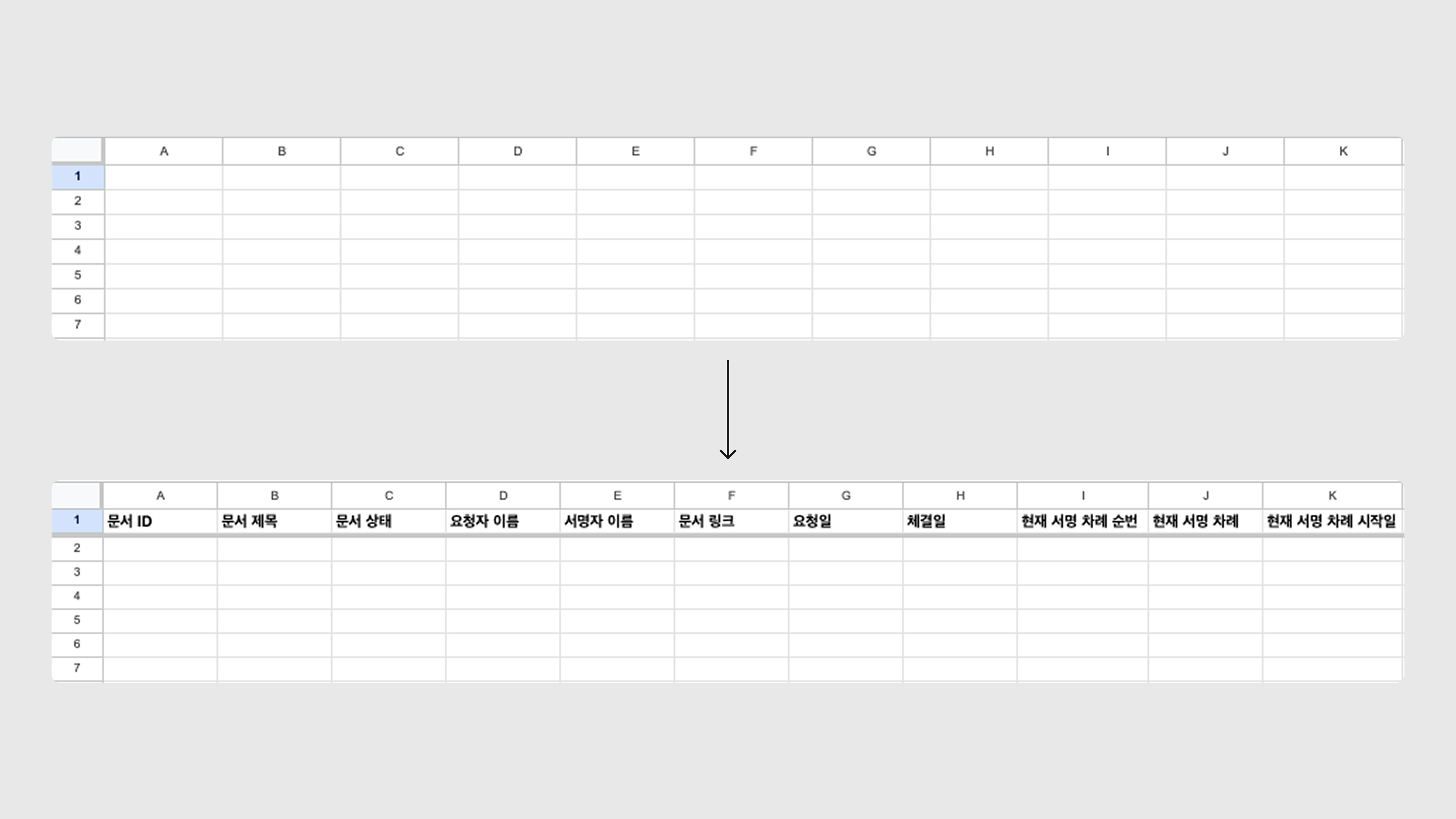 연동을 위한 양식(1행), 또는 구글 시트에 이미 동기화된 데이터를 임의로 편집한 경우 → 모두싸인과의 연결이 끊어져 최신 문서 데이터로 동기화되지 않을 수 있습니다.