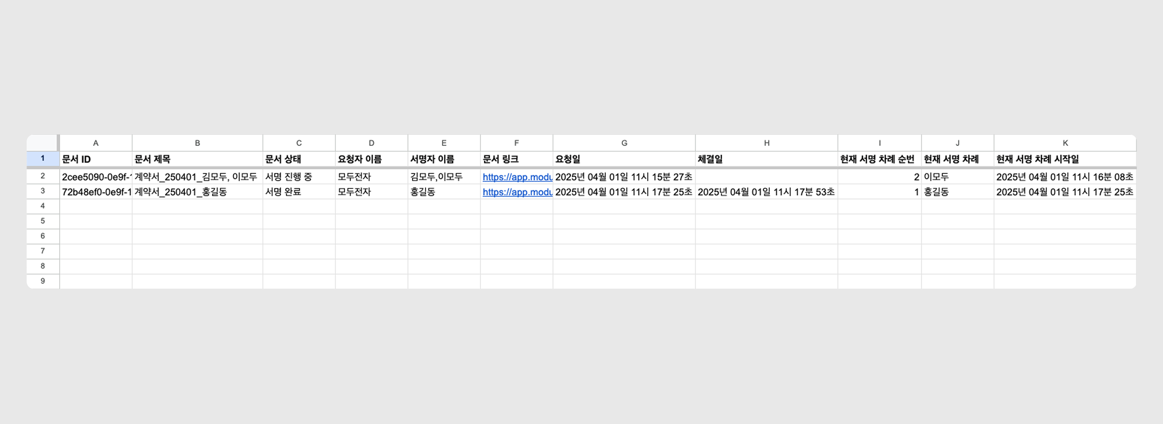 구글 시트 연결 후, 새로 서명/열람 요청하거나 시트에 연동된 문서의 상태가 변경되면, 구글 시트에서 문서 상태가 실시간으로 업데이트됩니다.
