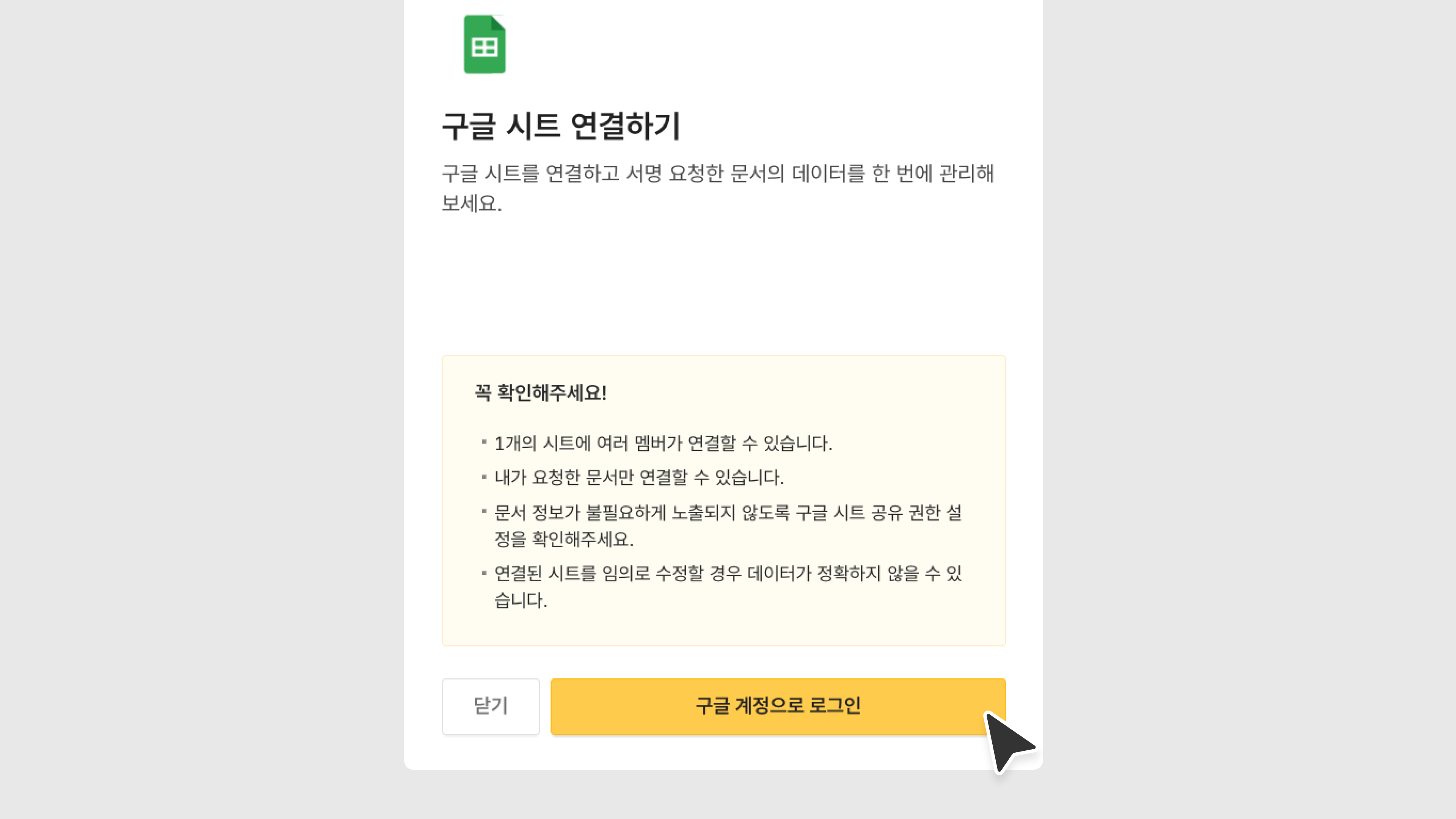 '문서 다운로드·전달·추출' 권한이 있는 멤버만 구글 시트를 연결할 수 있습니다.