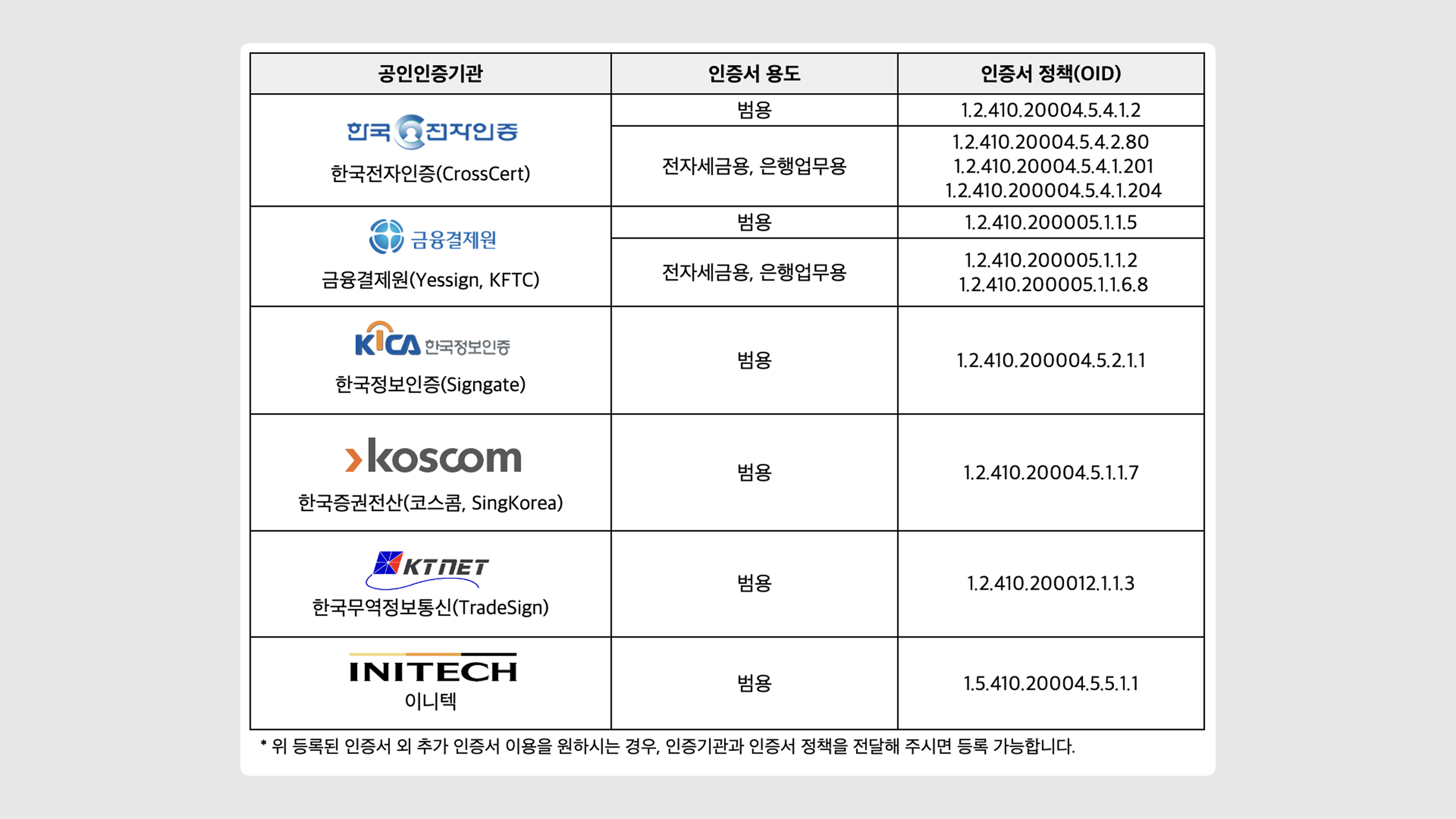 모두싸인에서 이용가능한 법인 공동인증서 종류는 아래와 같습니다.
