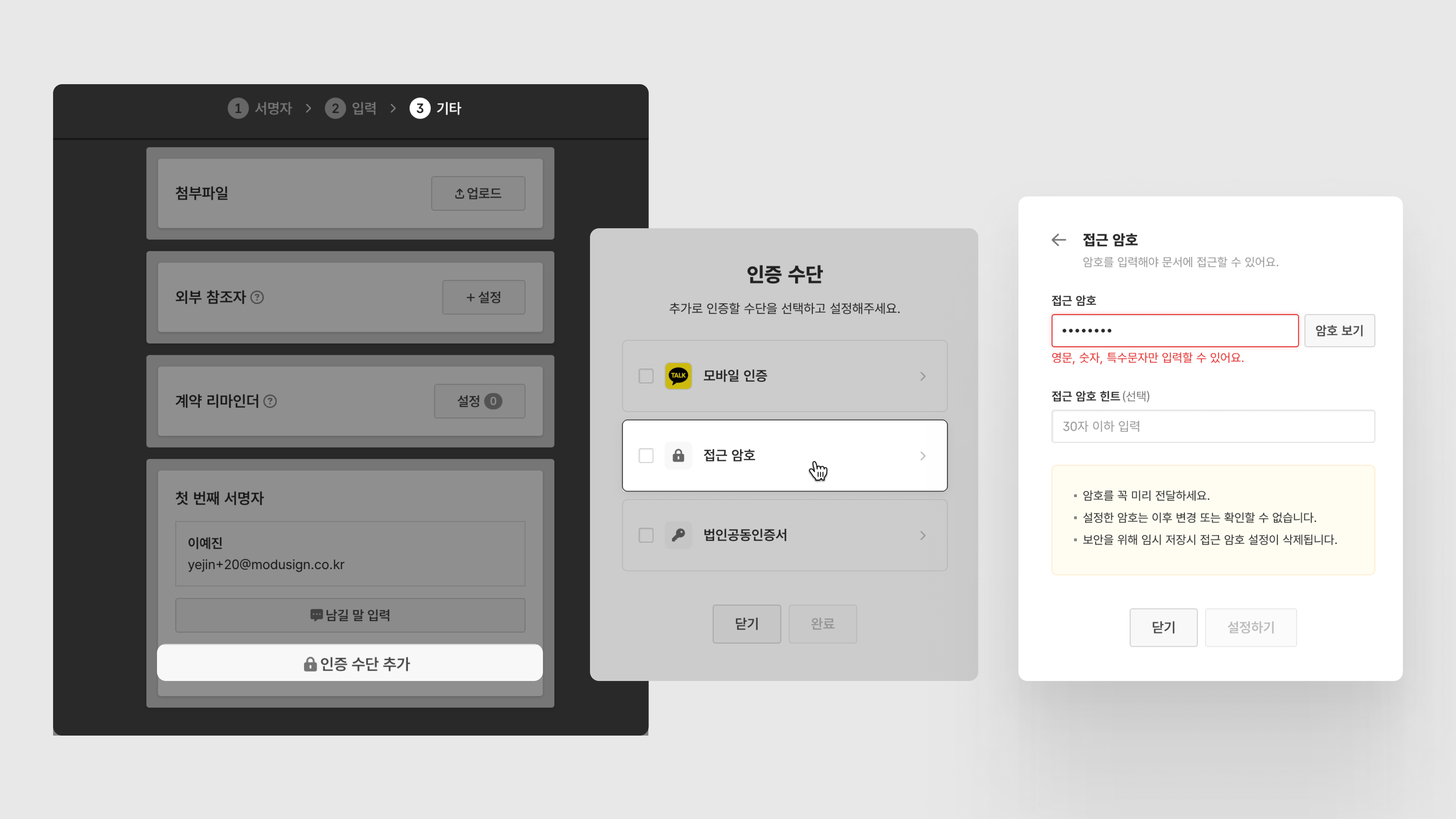 여러 명의 서명자와 계약을 진행하시는 경우, 서명자마다 다른 접근 암호를 설정하실 것을 권장드립니다. 이는 추후 보안 문제나 분쟁을 방지하기 위함입니다.