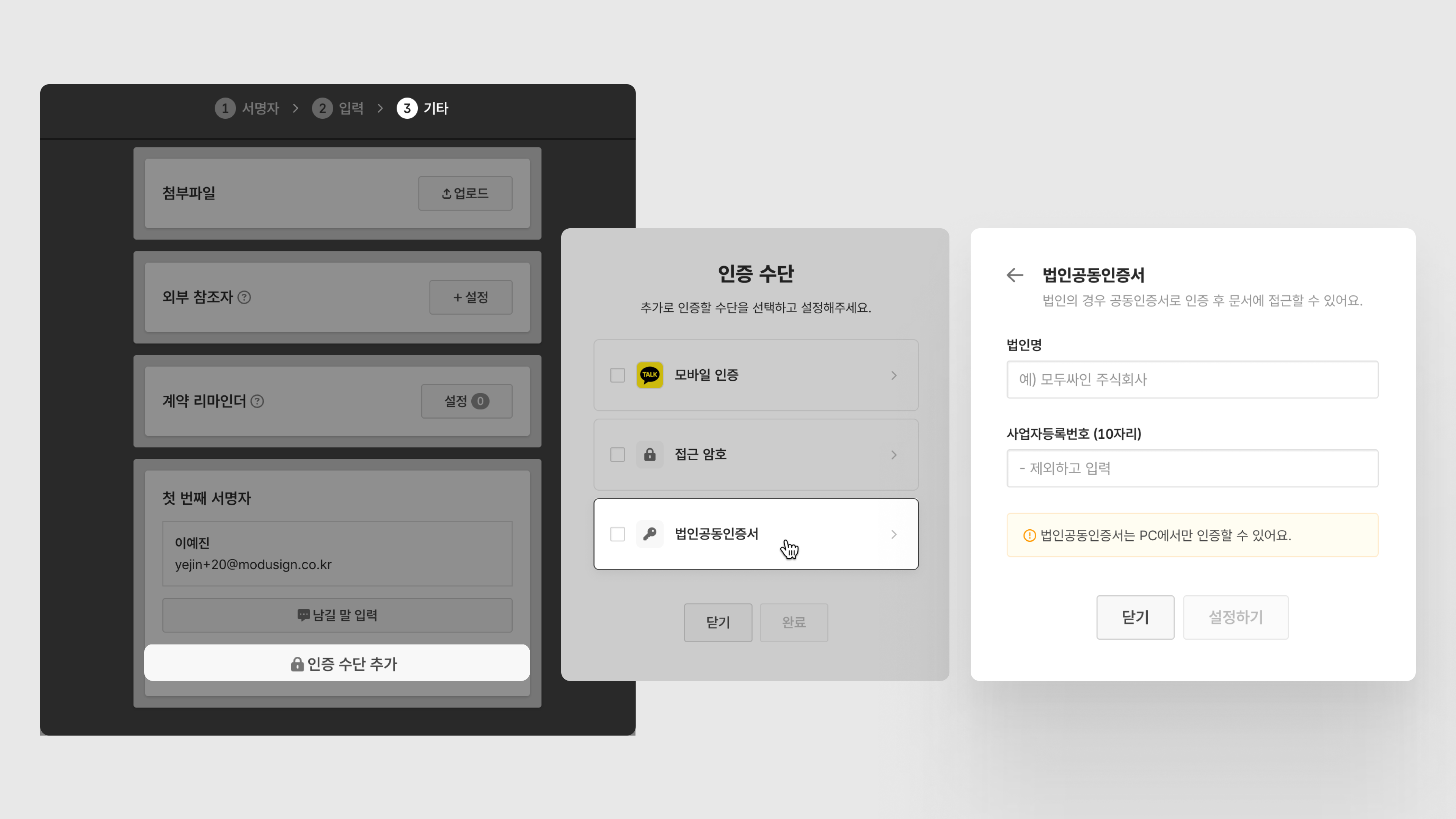 서명자가 법인일 경우 '법인 공동 인증서' 인증을 추가하여, 법인 명의 본인 인증 절차를 추가할 수 있습니다.
