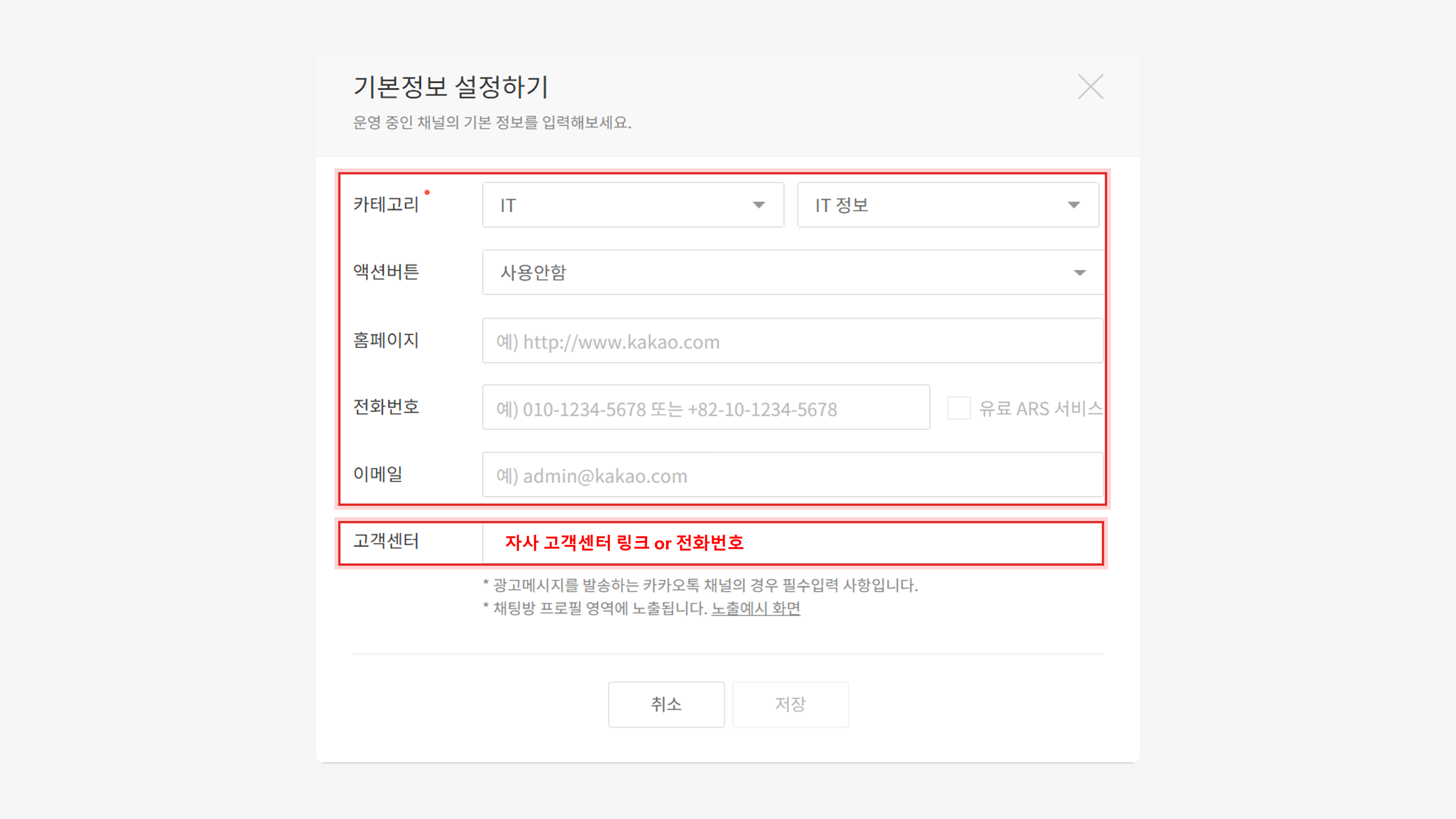 2023년 6월 22일 KISA 가이드에 따라 신규 발신프로필(채널) 등록 시 고객센터 정보 기입이 의무화되었습니다. 자세한 내용은 링크 참고 부탁드립니다. (카카오톡 채널 공지사항)