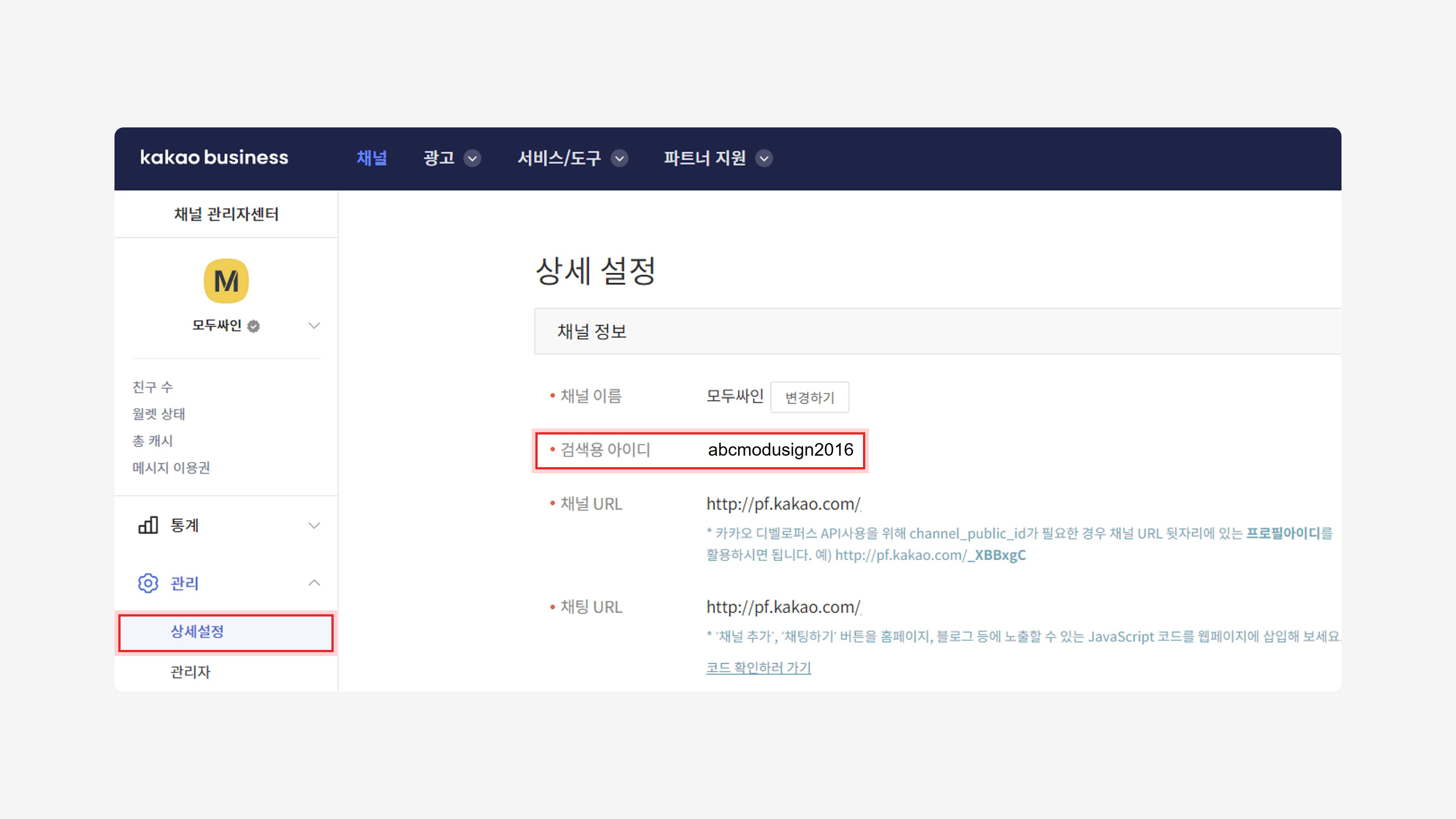 [채널 관리자센터] 메뉴 중 하단 [관리] > [상세설정]에서 검색용 아이디를 확인할 수 있습니다.
