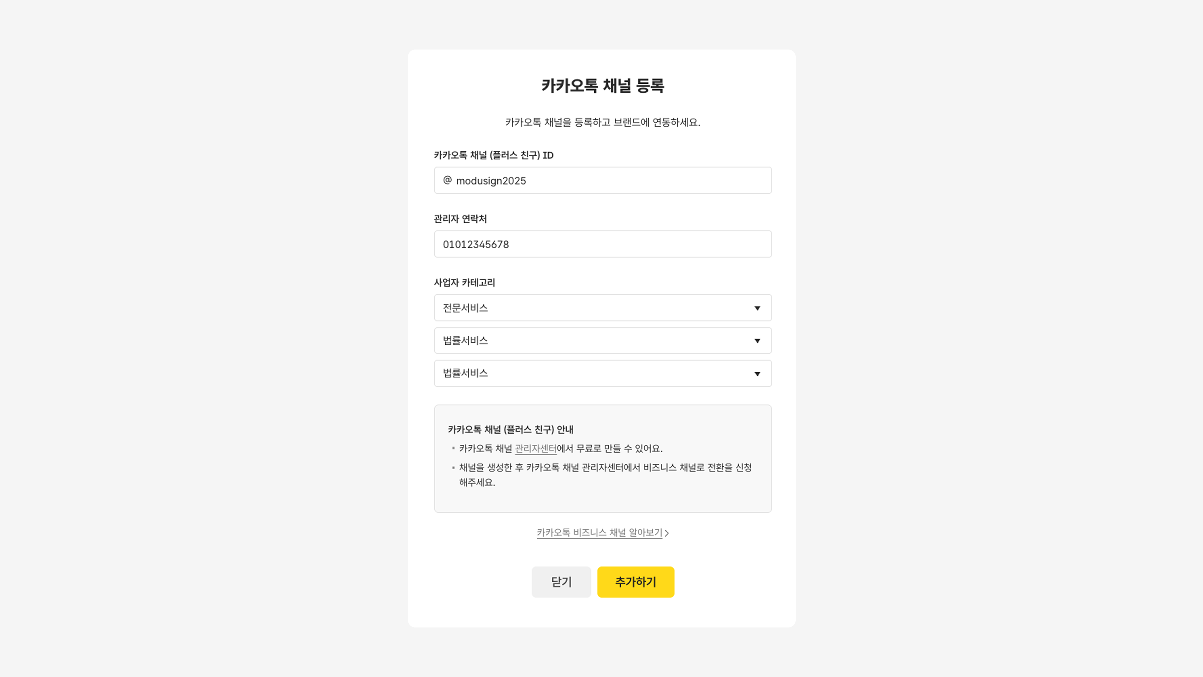 연동할 카카오톡 채널 ID, 관리자 연락처, 사업자 카테고리를 입력 후 [추가하기] 버튼을 클릭합니다.