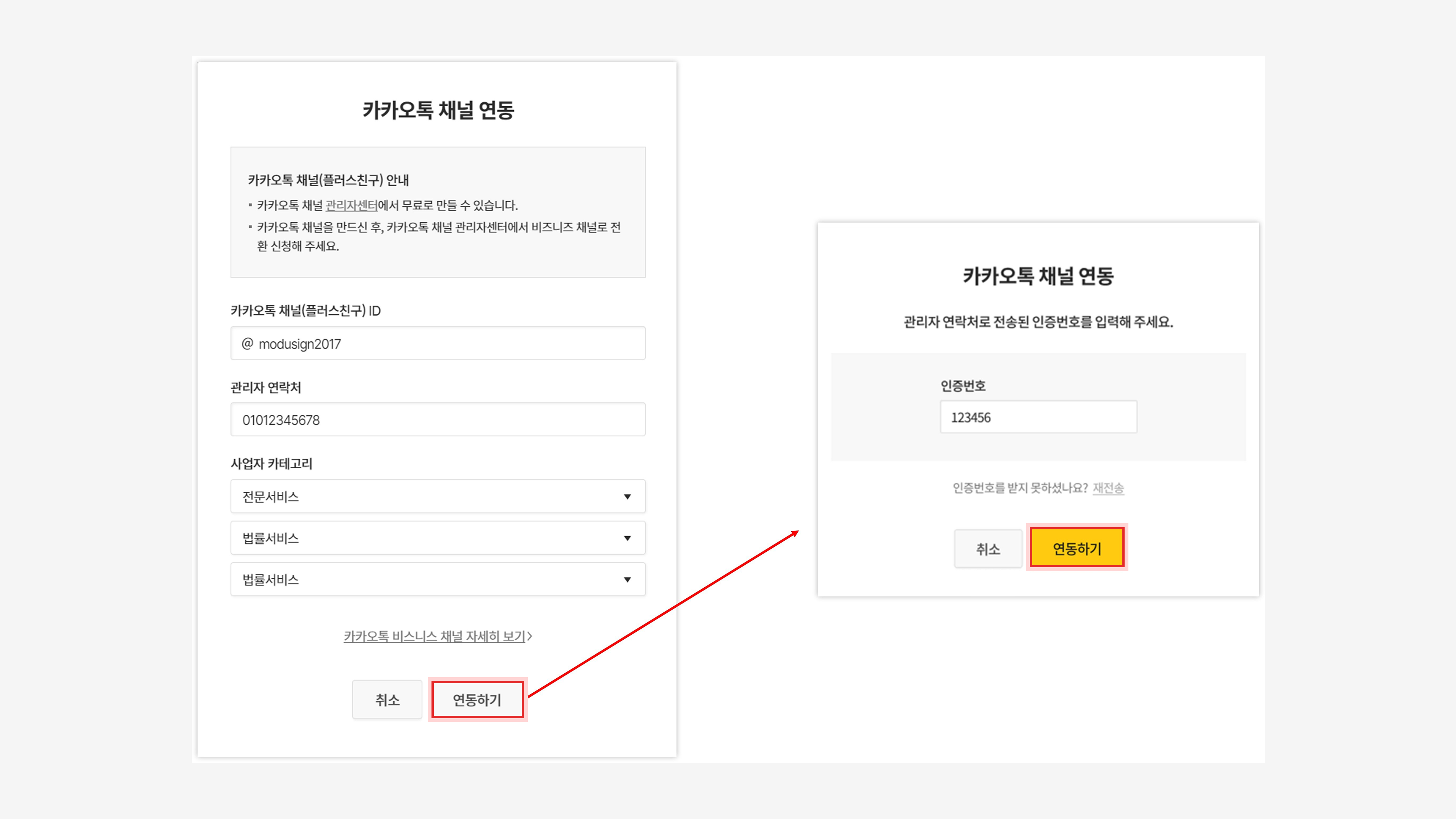 카카오 비즈니스 통합 서비스 가입 > 채널 개설 > 카카오 비즈니즈 채널 신청 절차 진행 후, 모두싸인 내 연동이 가능합니다.