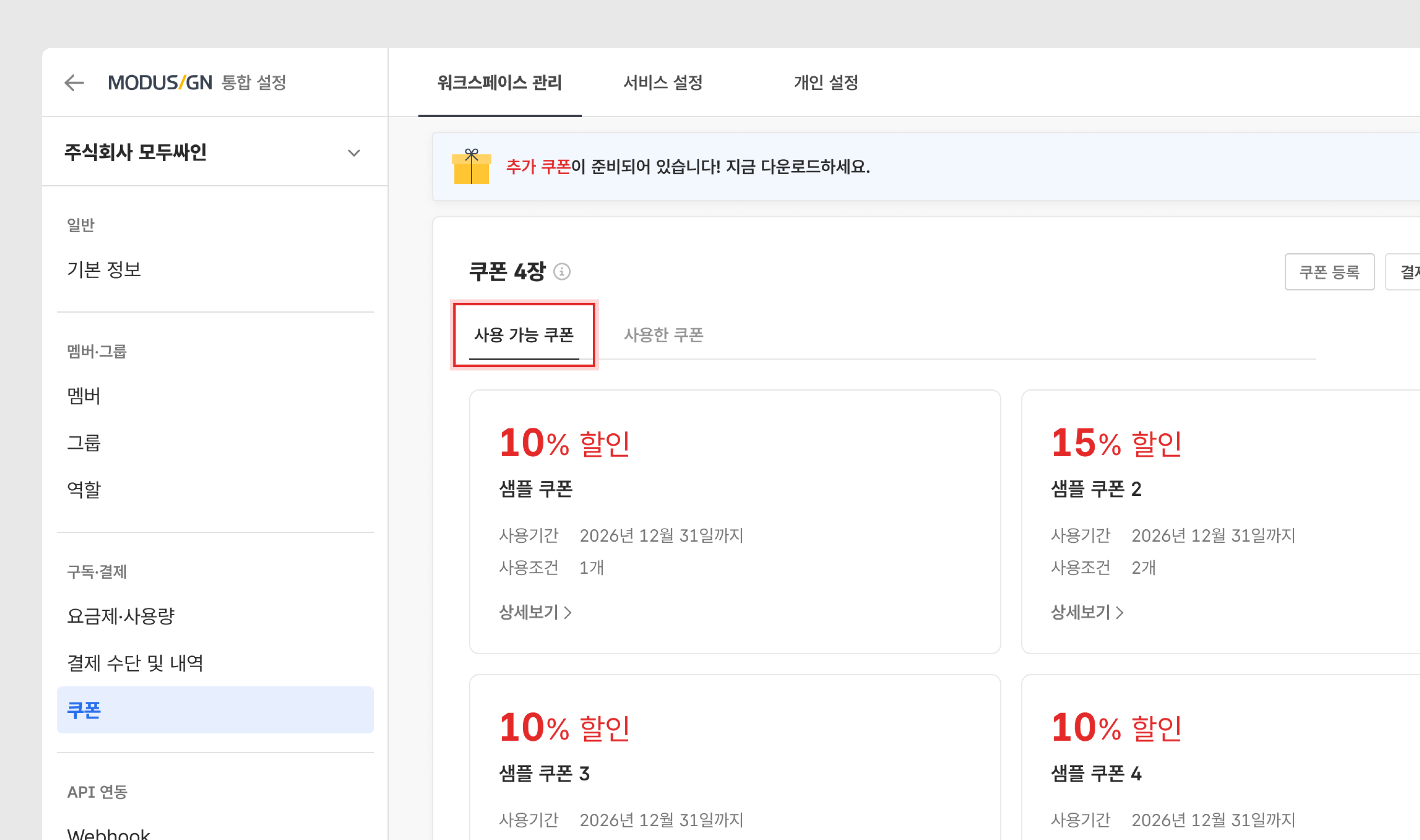 우측 상단 통합 설정 ⚙︎ 버튼 클릭 > 워크스페이스 관리 > 쿠폰 메뉴를 클릭합니다.