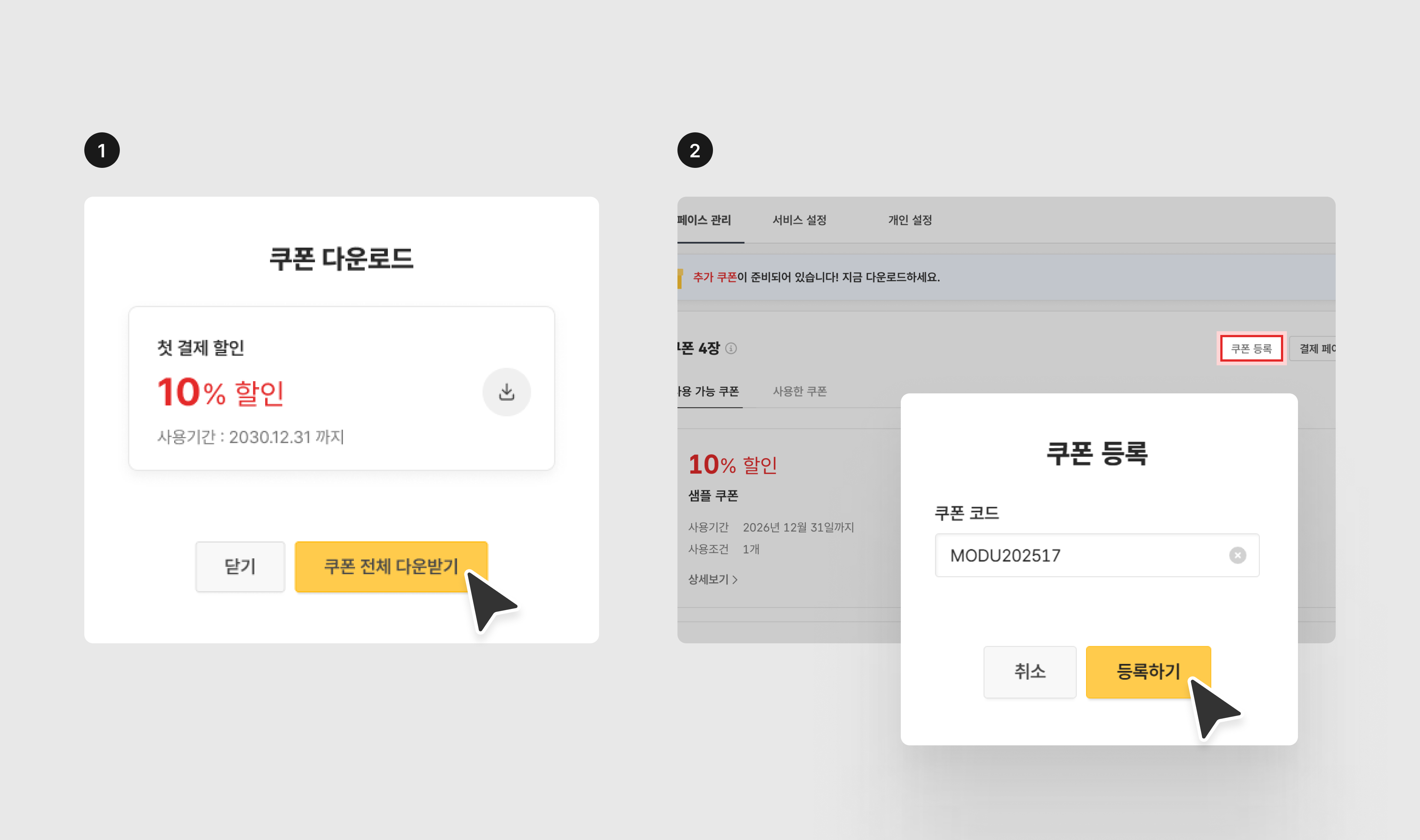마케팅 켐페인에서 받은 할인 코드가 있다면, ❷ 쿠폰 등록 버튼을 눌러 추가합니다.
