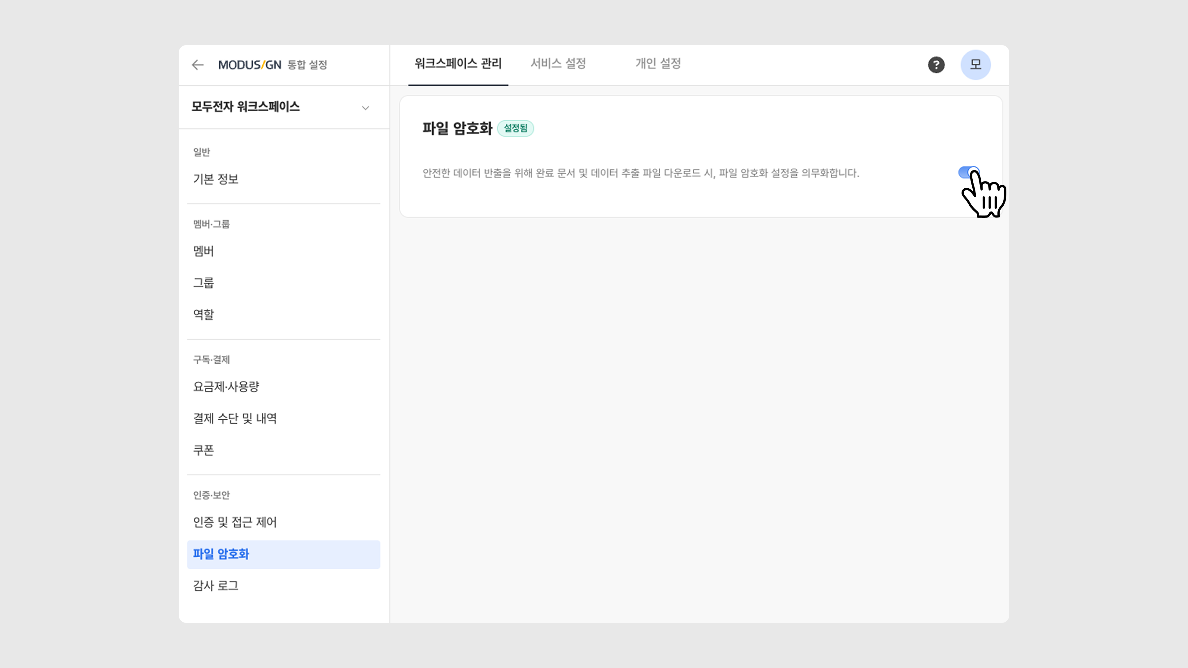 우측 상단 통합 설정 ⚙︎ > 워크스페이스 관리 > 좌측 하단의 [파일 암호화] 메뉴 > 파일 암호화 설정을 활성화합니다.
