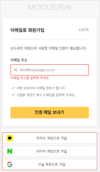 카카오 계정에 등록된 이메일이 카카오에서 제공하는 인증을 거치지 않은 경우, 모두싸인 카카오톡 회원 가입이 불가할 수 있습니다.