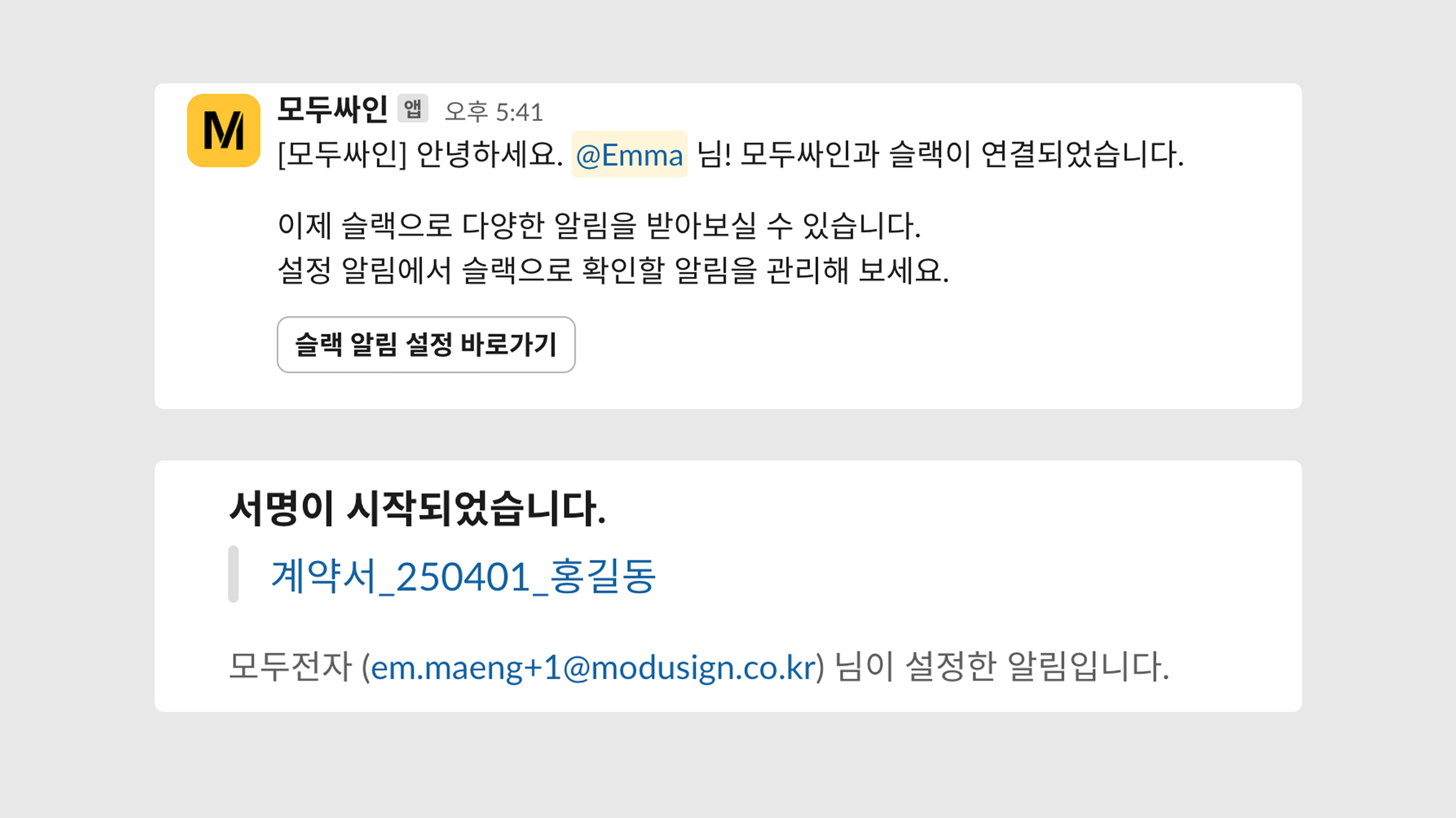 연동이 완료되면 내가 요청한 문서에 대한 알림을 연동한 슬랙 채널로 전달받을 수 있습니다.