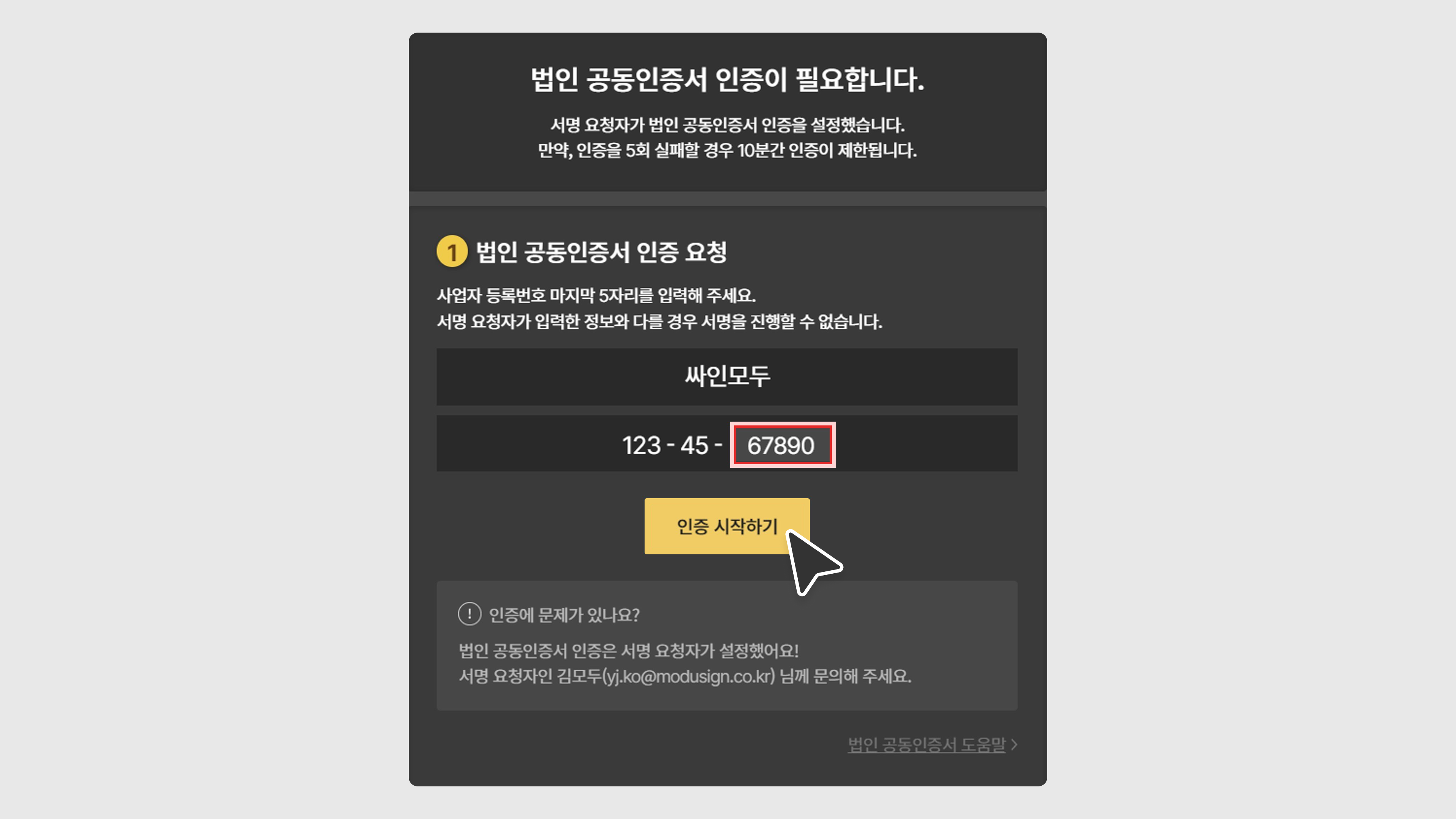 서명 요청자가 설정한 사업자 번호와 다를 경우 인증이 실패할 수 있습니다. (인증 5회 실패할 경우, 10분간 인증이 제한됩니다.)