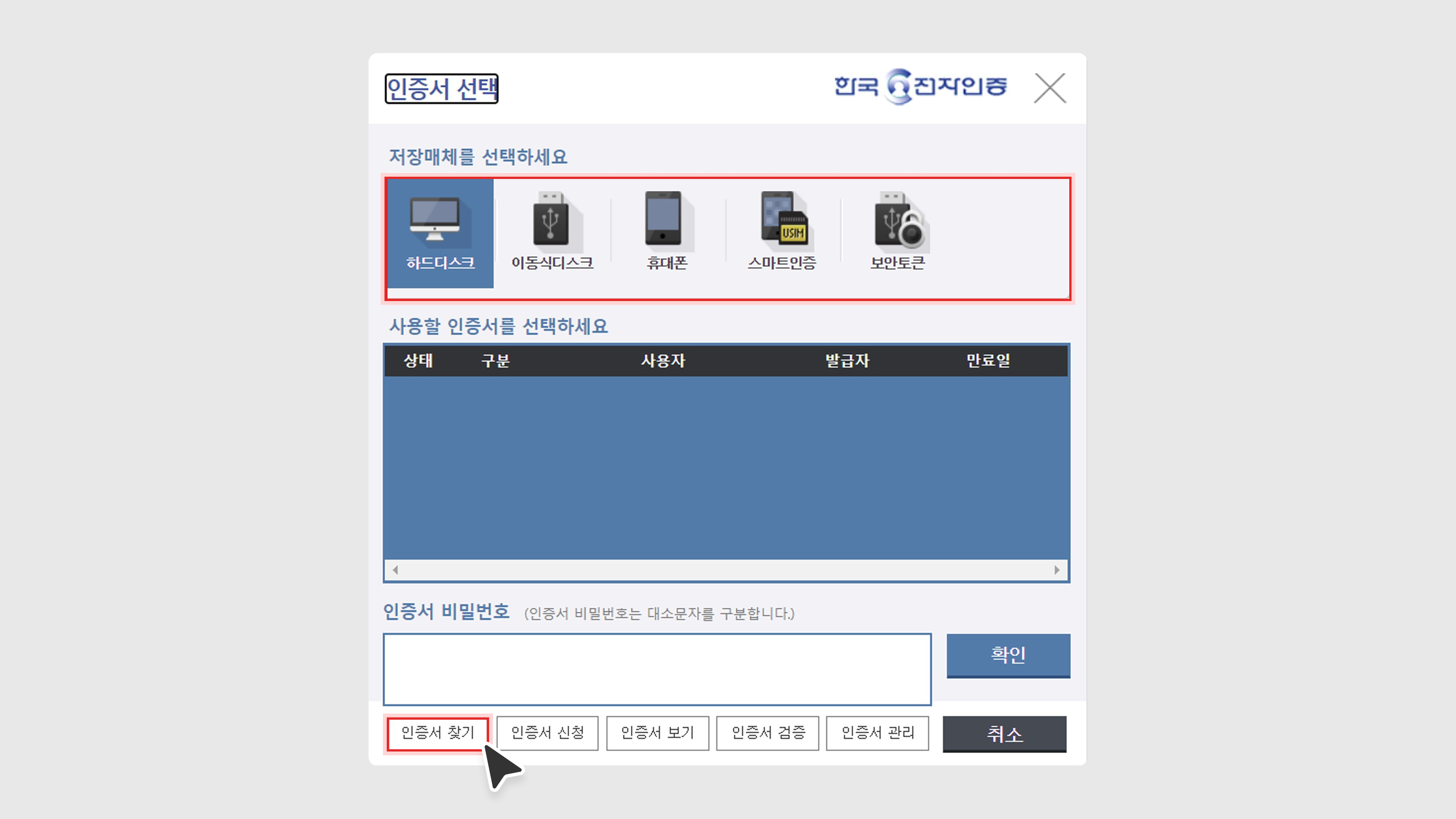 [인증서 가져오기] 버튼을 통해 선택한 저장 매체에 있는 법인 공동인증서를 불러옵니다.