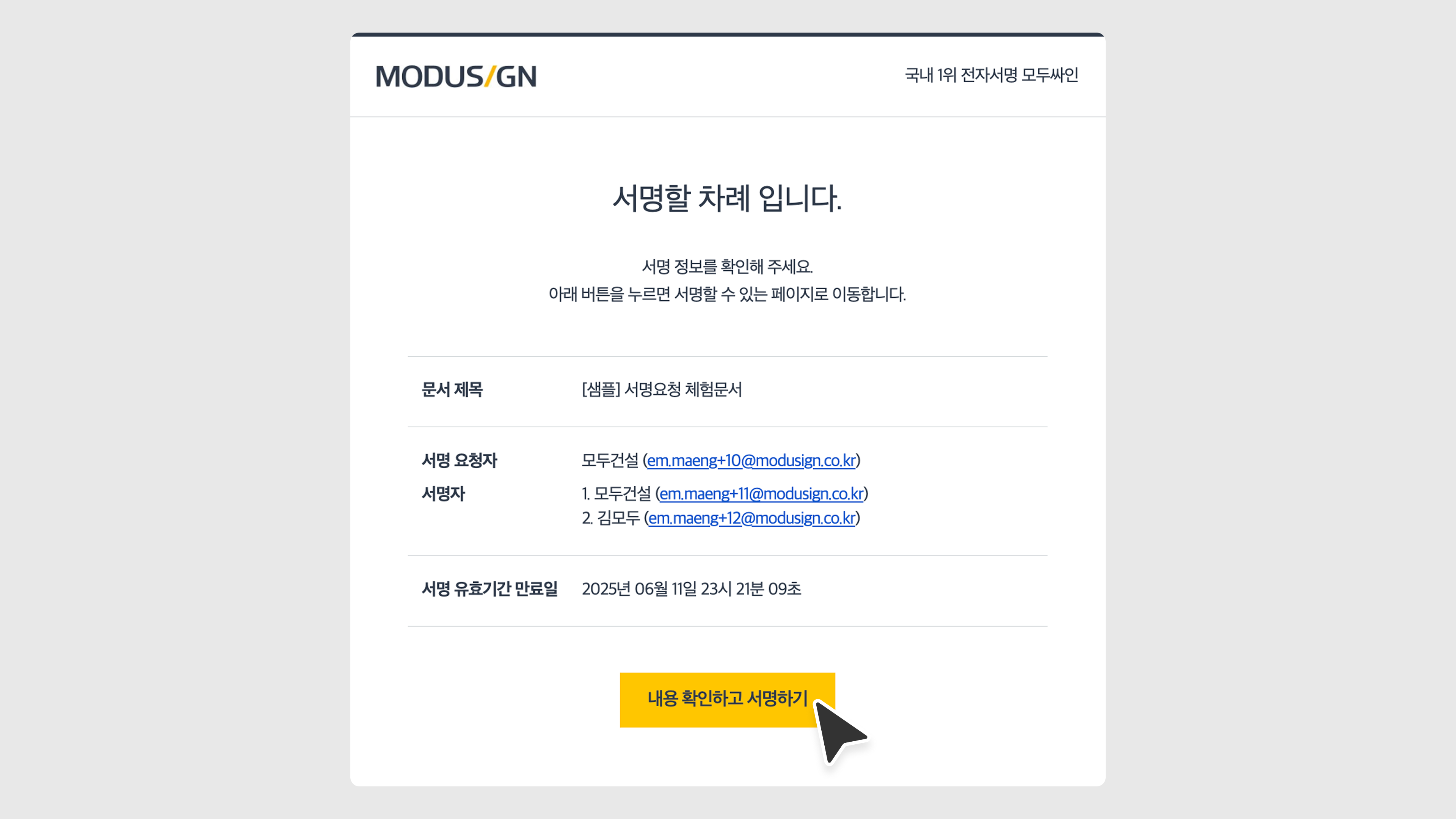 이메일로 수신한 서명 요청 확인 후, [내용 확인하고 서명하기] 버튼을 클릭합니다.