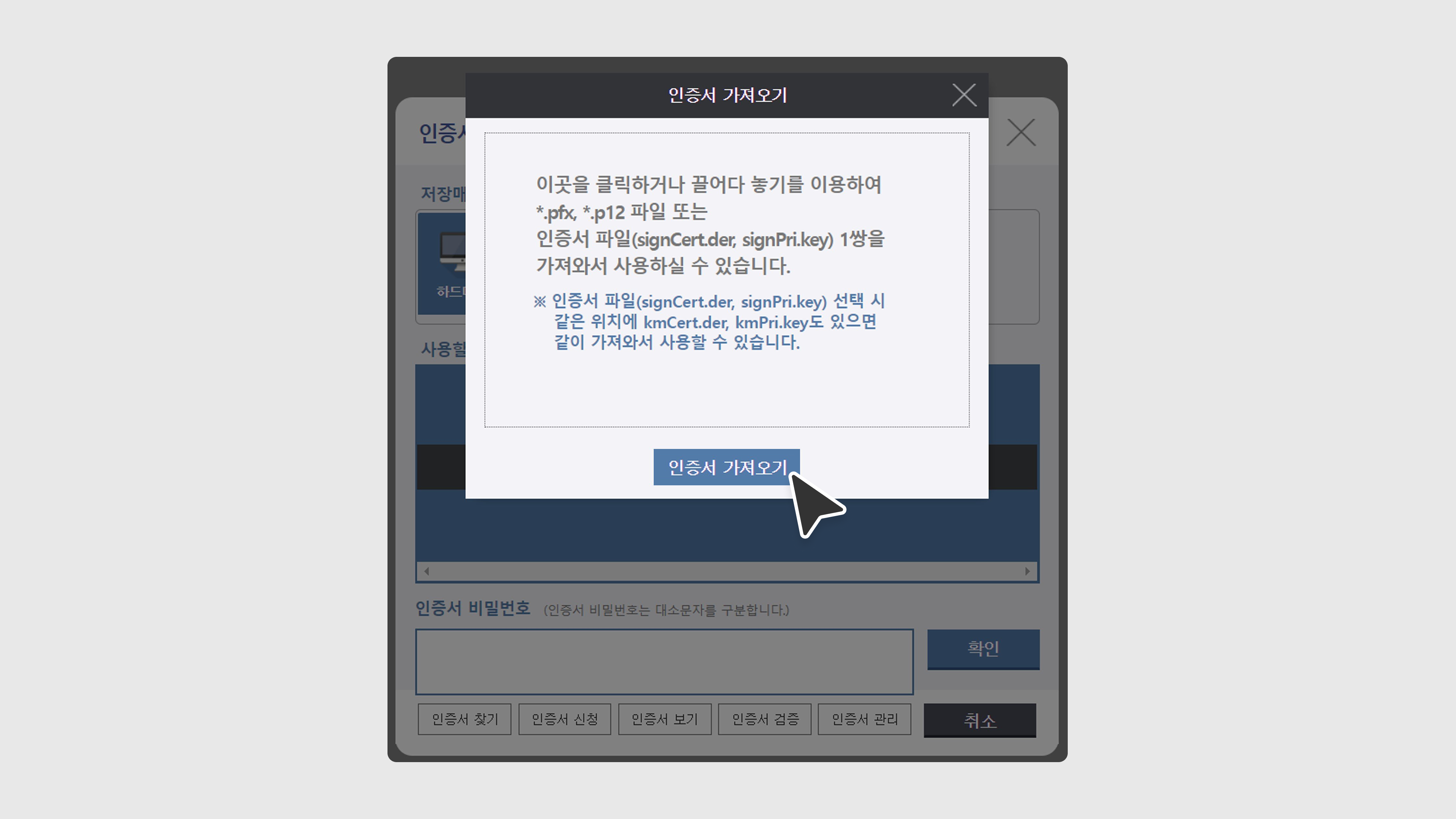 [인증서 가져오기] 버튼을 통해 선택한 저장 매체에 있는 법인 공동인증서를 불러옵니다.