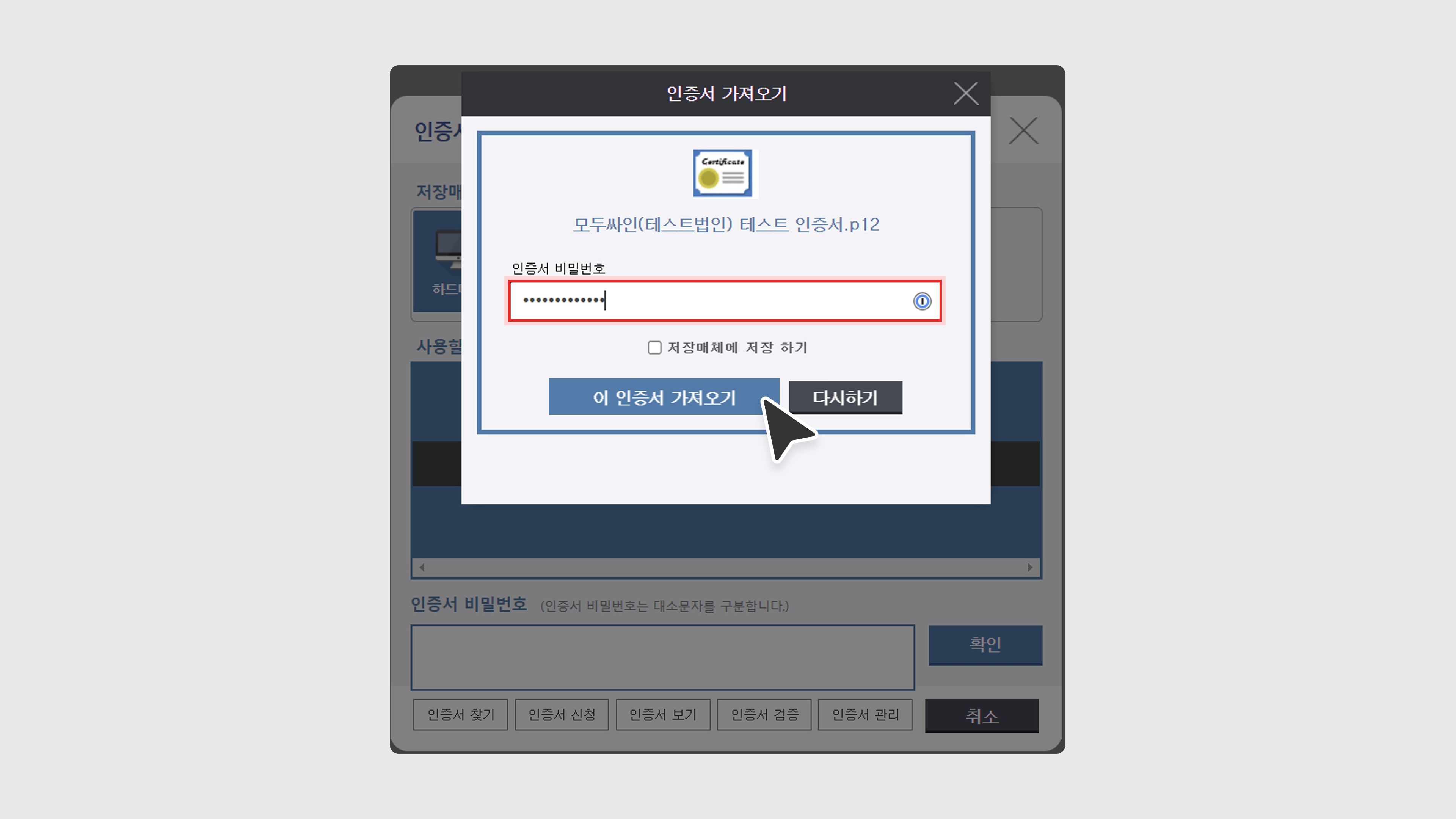 인증서를 불러온 뒤, 인증서 비밀번호를 정확히 입력하고 [이 인증서 가져오기] 버튼을 클릭합니다.