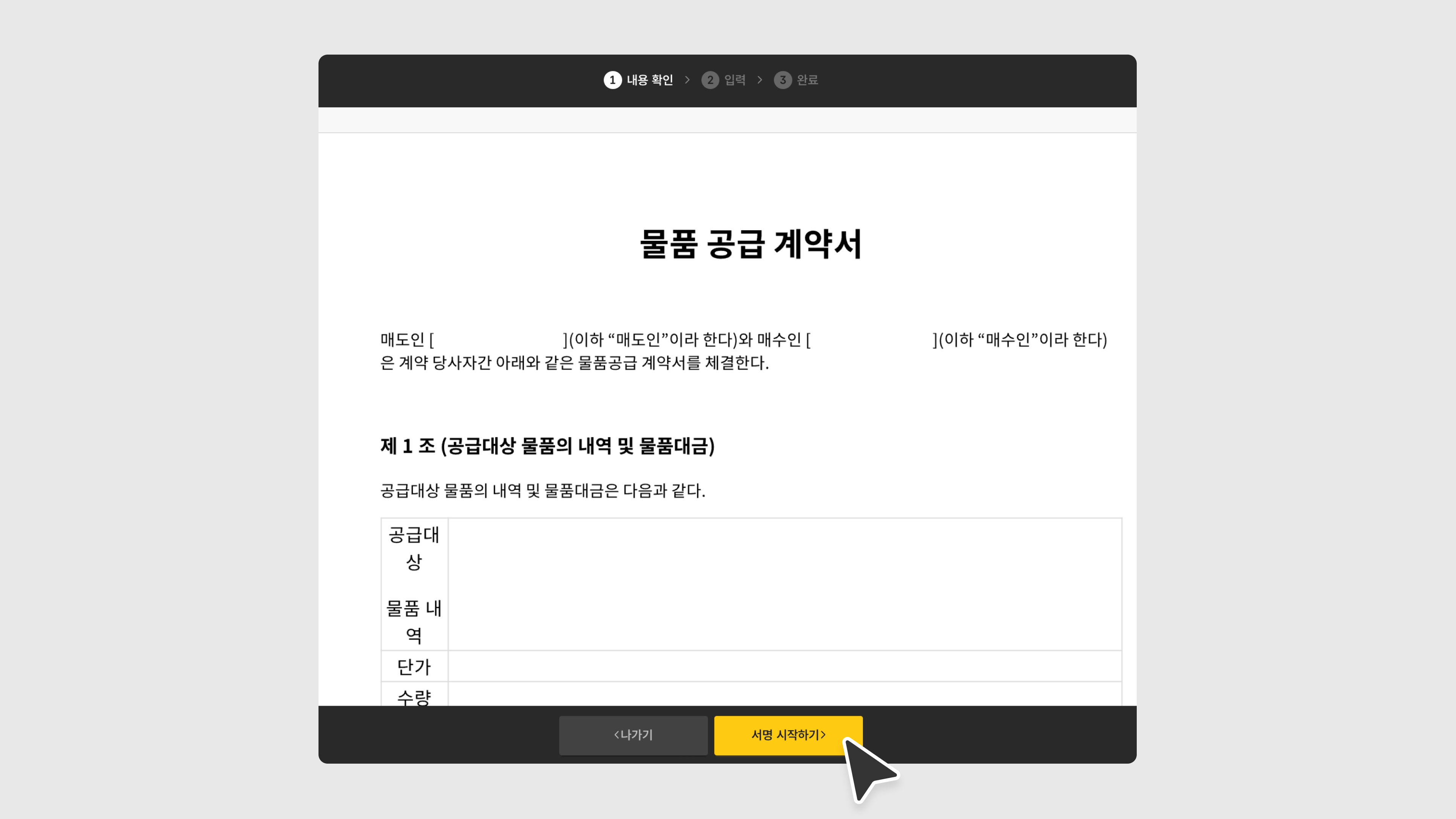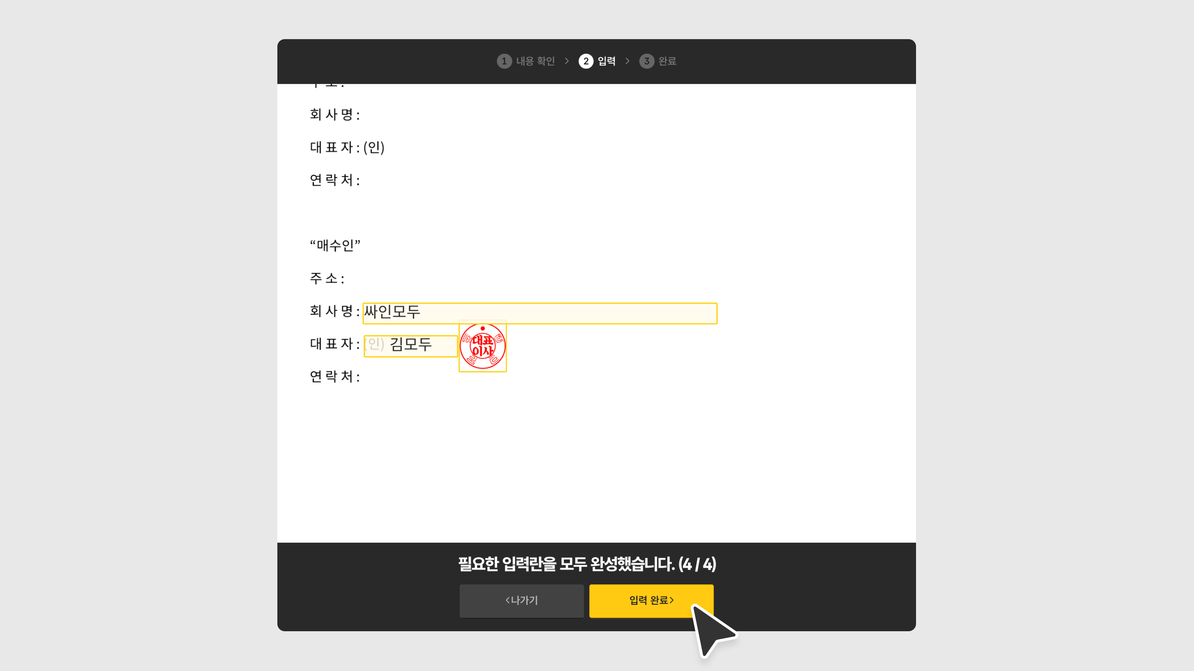 모든 입력란에 빠짐없이 내용을 입력한 뒤, [입력 완료] 버튼을 눌러 서명을 완료합니다.